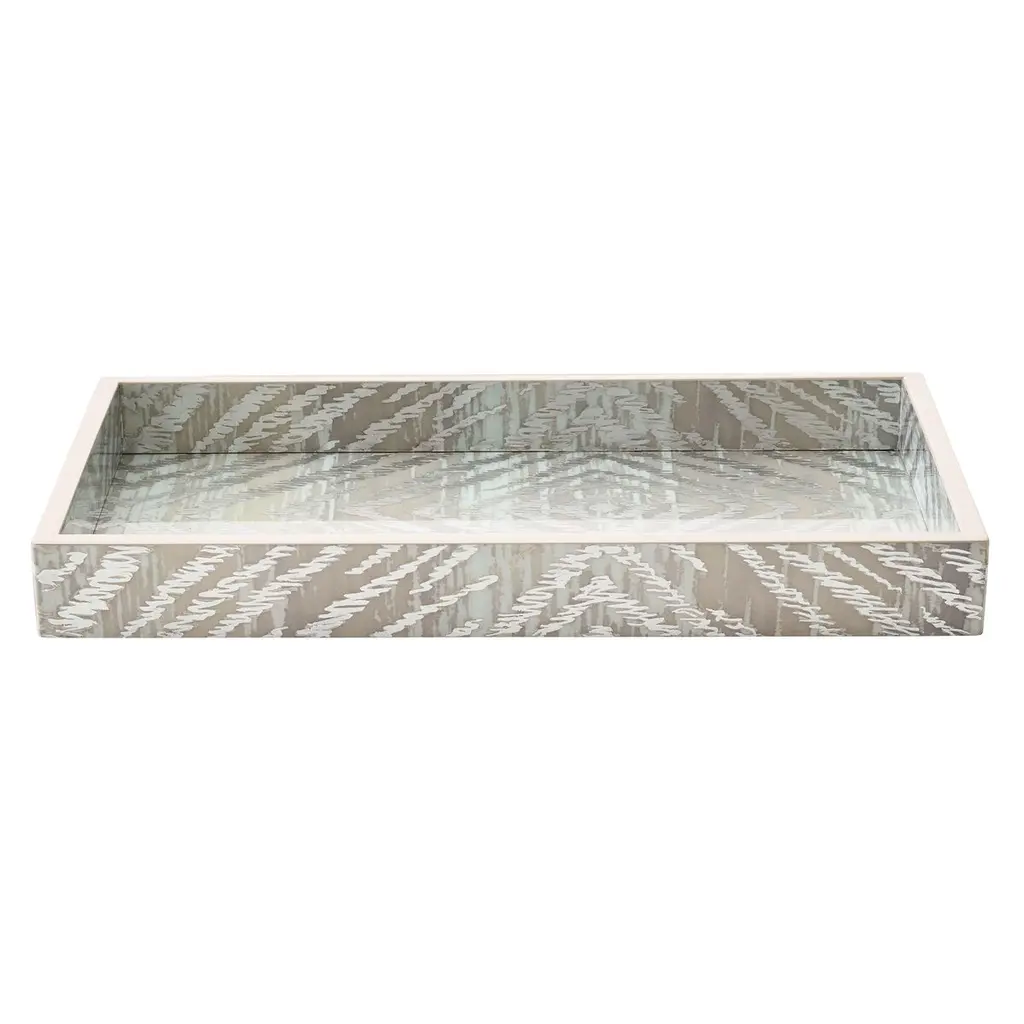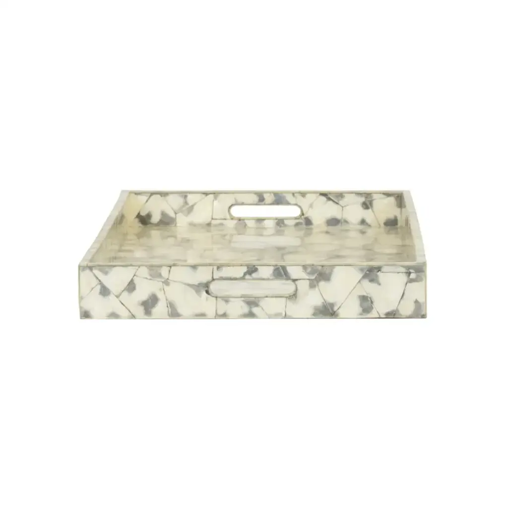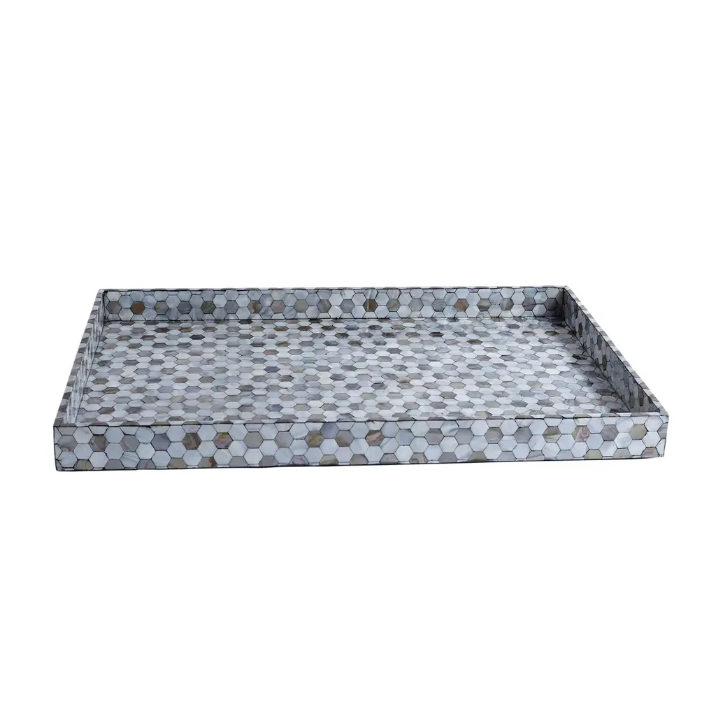 Covered in gray tortoise capiz shell, shell shock tray is ideal for serving guests at a cocktail party or holding the remote and decorative accents on a large ottoman or cocktail table.