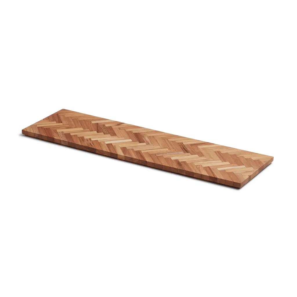 Sild Serving Tray from the Skagerak Collection by Fritz Hansen functions as a cutting board and serving board at the same time. The composition of small wooden sticks in teak forms an elegant herringbone pattern, emphasized by the many nuances and grains in the wood. ‘Sild’ means herring in Danish, which explains the name. Features