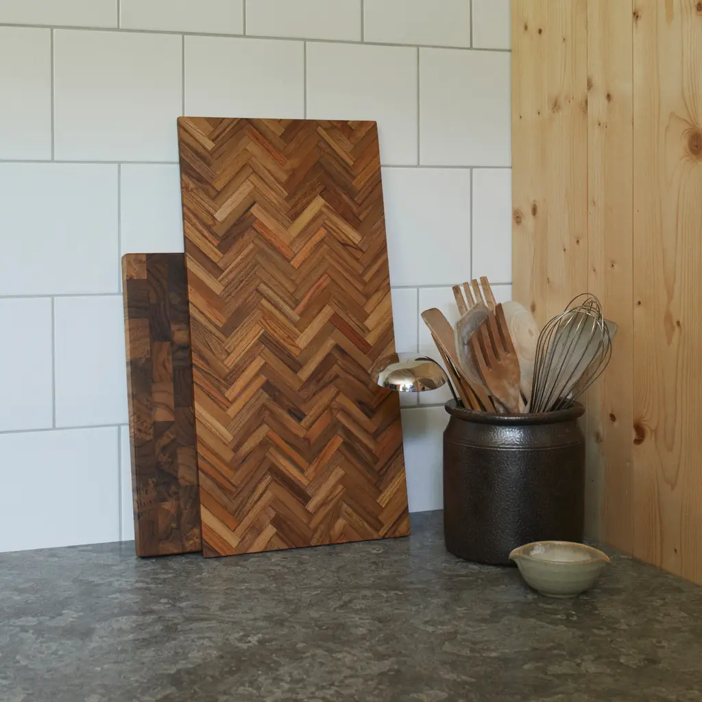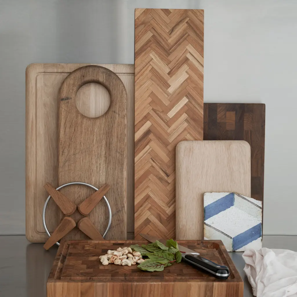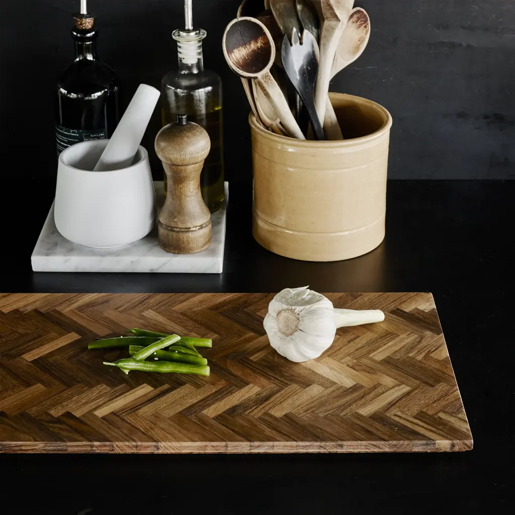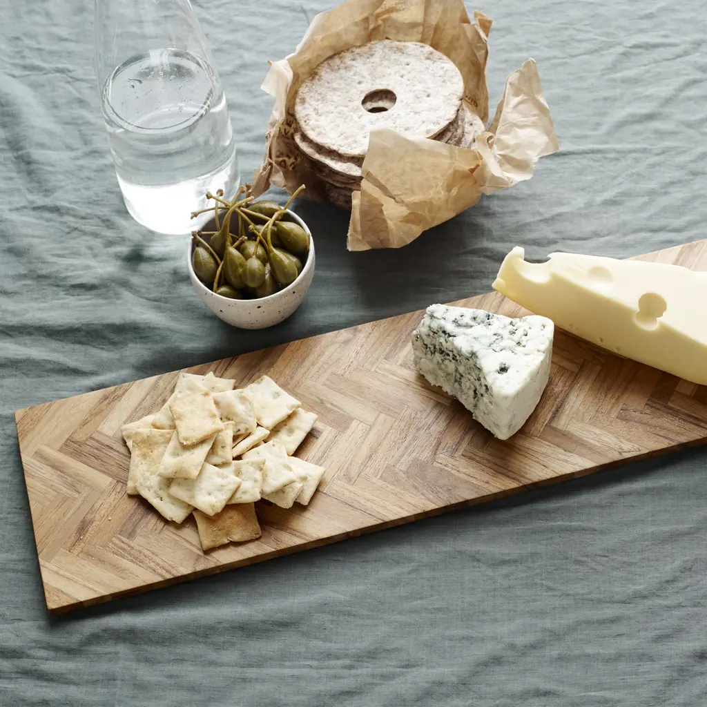 Designer Søren Refsgaard introduces Sild, a tray that functions as both a cutting board and an implement for serving at the same time. An elegant composition of small wooden pieces in teak forms an elegant herringbone pattern which emphasizes the many nuances and grains in the sustainably sourced wood. Sild means “herring” in Danish, which makes a nod to its Nordic roots.