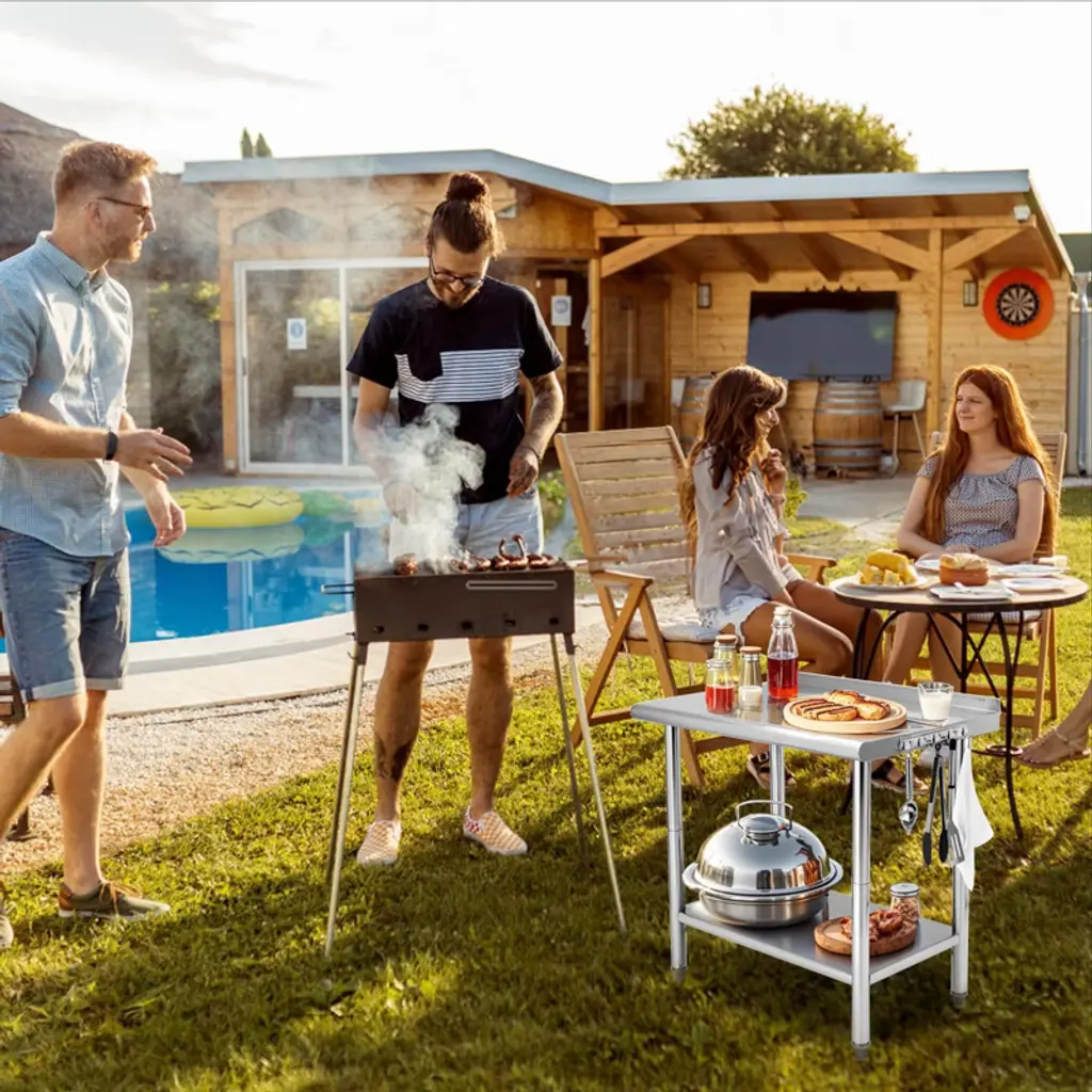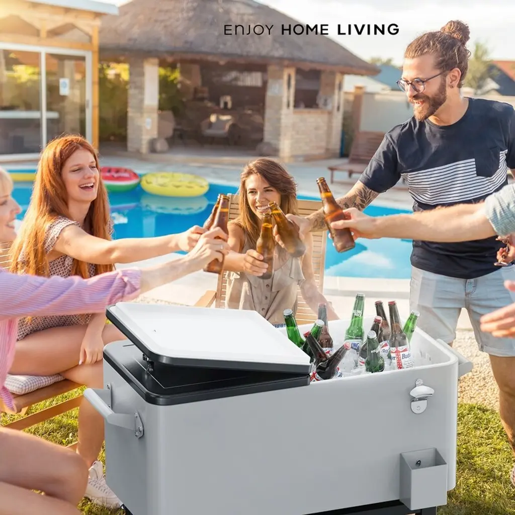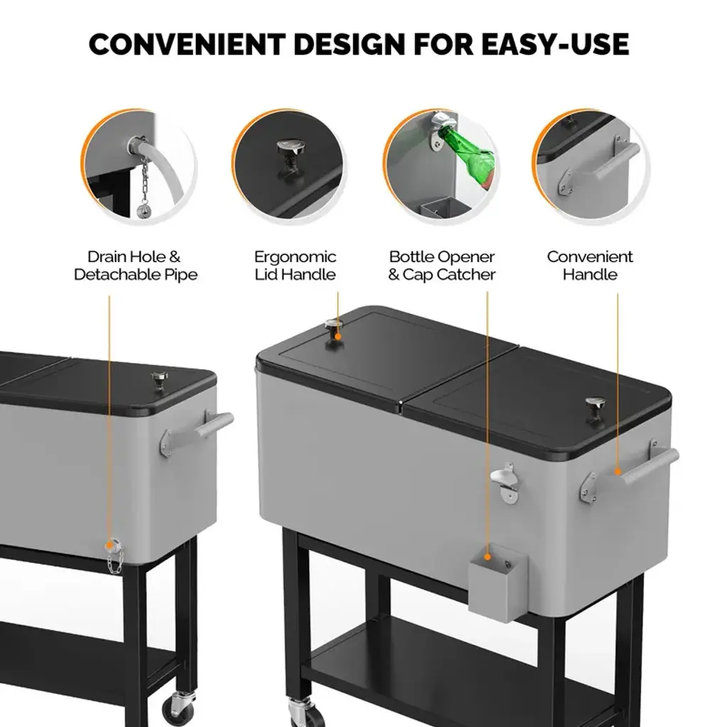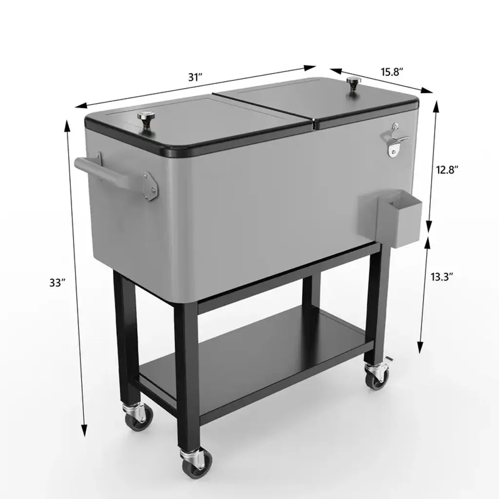 Introduction:Introducing our 80 Qt. Silver Gray Double-Tray Cooler Cart, the perfect solution for keeping your beverages chilled and organized at any outdoor event, party, or gathering. Designed with a sleek silver gray color and equipped with advanced freezing and insulation technology, this cart ensures that your drinks stay refreshingly cold for hours.Features:Double-Tray Design: The cart features an innovative double-tray design that allows for easy separation and organization of your beverages. You may use the box and the double-tray base separately, as they are detachable.Freezable & Insulated: Constructed with a high-quality plastic box and insulated walls, the cart maintains a consistent cold temperature, keeping your drinks fresh and delicious. Mobile & Convenient: Equipped with four sturdy wheels and a black base, the cart is easy to move and position wherever you need it. The compact design also allows it to fit into tight spaces, making it perfect for any event setup.Durable Materials: Made from durable plastic and iron, the cart is built to last. The plastic box is resistant to stains and scratches, while the iron feet provide stability and support.Spacious Storage: With a generous capacity of 80 quarts, the cart can hold a variety of beverage bottles, cans, and even larger containers. The spacious interior ensures that you'll always have enough cold drinks on hand for your guests.Specification:Color: Silver GrayCapacity: 80QTDimensions: 31 in. x 15.8 in. x 33 in. (W x D x H)Material: Plastic Box, Iron BasePackage Contents:1 x cooler cart1 x hardware pack1 x Assembly InstructionsTo ensure the optimal performance, safety, and longevity of your cooler cart, kindly adhere to the following usage instructions:It is crucial to drain the water from the cart's compartment promptly after use, as failure to do so may result in:1. Compartment Expansion: Accumulated water left untreated may cause the compartment to expand, distort or crack.2. Reduced Insulation Efficiency: Moisture can compromise the insulation properties, allowing heat to penetrate more easily and reducing the cart's ability to maintain chilled temperatures.3. Structural Damage: Prolonged exposure to moisture can weaken the cart's structure, making it unstable and unsafe for use.Thank you for your attention to these important guidelines. Safe usage and proper maintenance will maximize the performance and lifespan of your cooler cart.