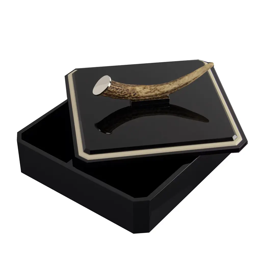 A versatile piece of timeless elegance, this 925 sterling silver tray evokes quality levels of forgotten times. The polished finish enhances the octagonal silhouette boasting high borders with a wide, flat rim and two splendid handles fashioned of genuine antlers. Translating seamlessly from traditional to contemporary, from casual to formal, this tray is a perfect gift to create a cherished family heirloom. Please note that the antlers used are harvested from the natural shedding process, no animal is ever harmed in the making of this piece.