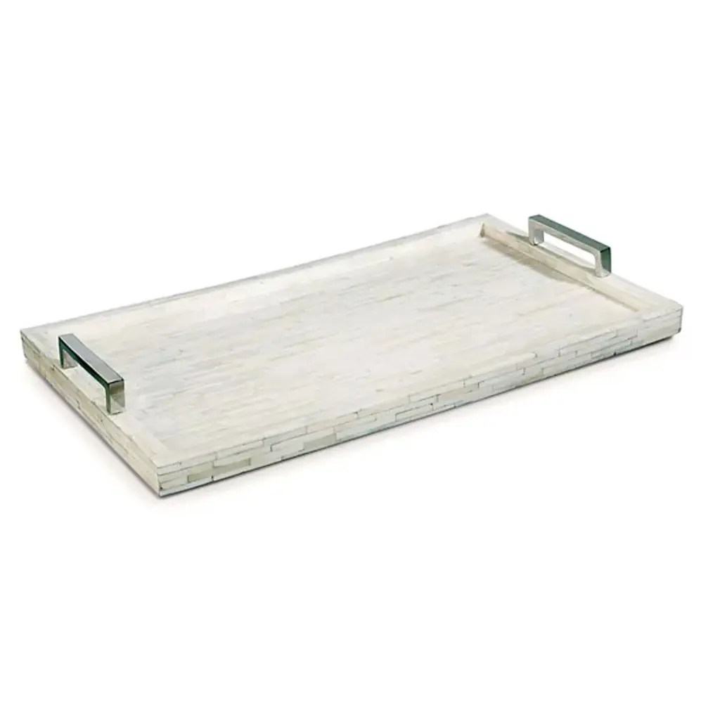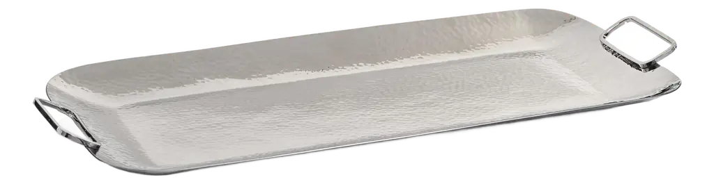 The Silver Serpent Tray is a stylish contemporary design that embraces natural textures. Crafted from Polished Steel, this rectangular decorative tray features two handles and a detailed snakeskin pattern along the inside surface.