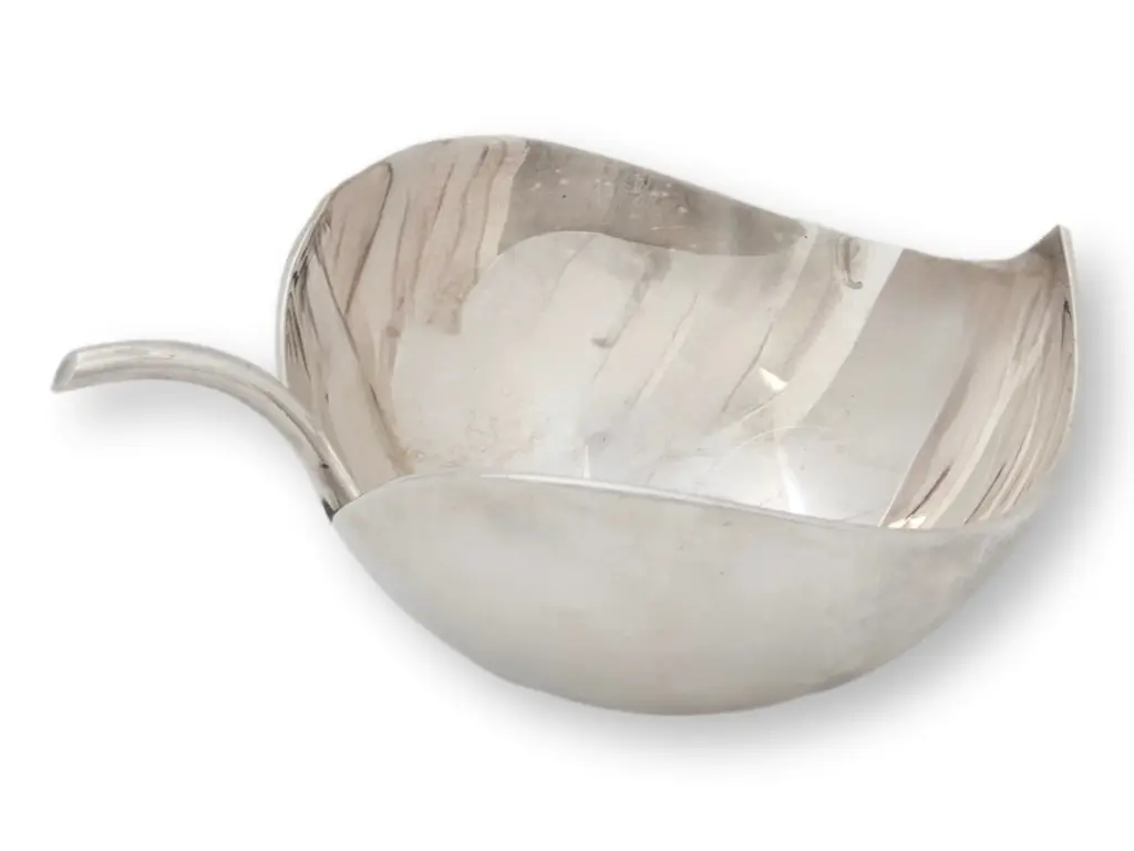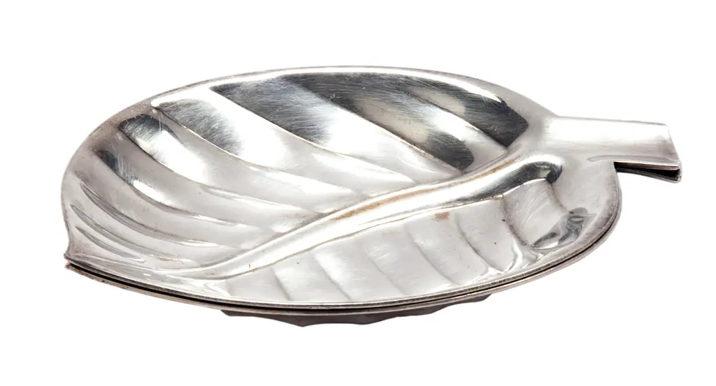 Mid Century Silver plate leaf trays, hallmark by International Silver on the underside. There is a peek of smooth brass peeking through the silver finish on 1 of the trays. By International Silver.