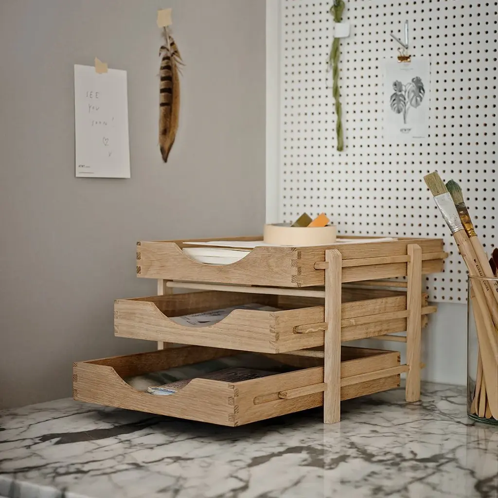 A letter tray with graduated levels in a classic and recognizable office expression with three functional oak trays, designed by VE2. For added flexibility, you can pull out a tray and take it with you when you work away from your desk.