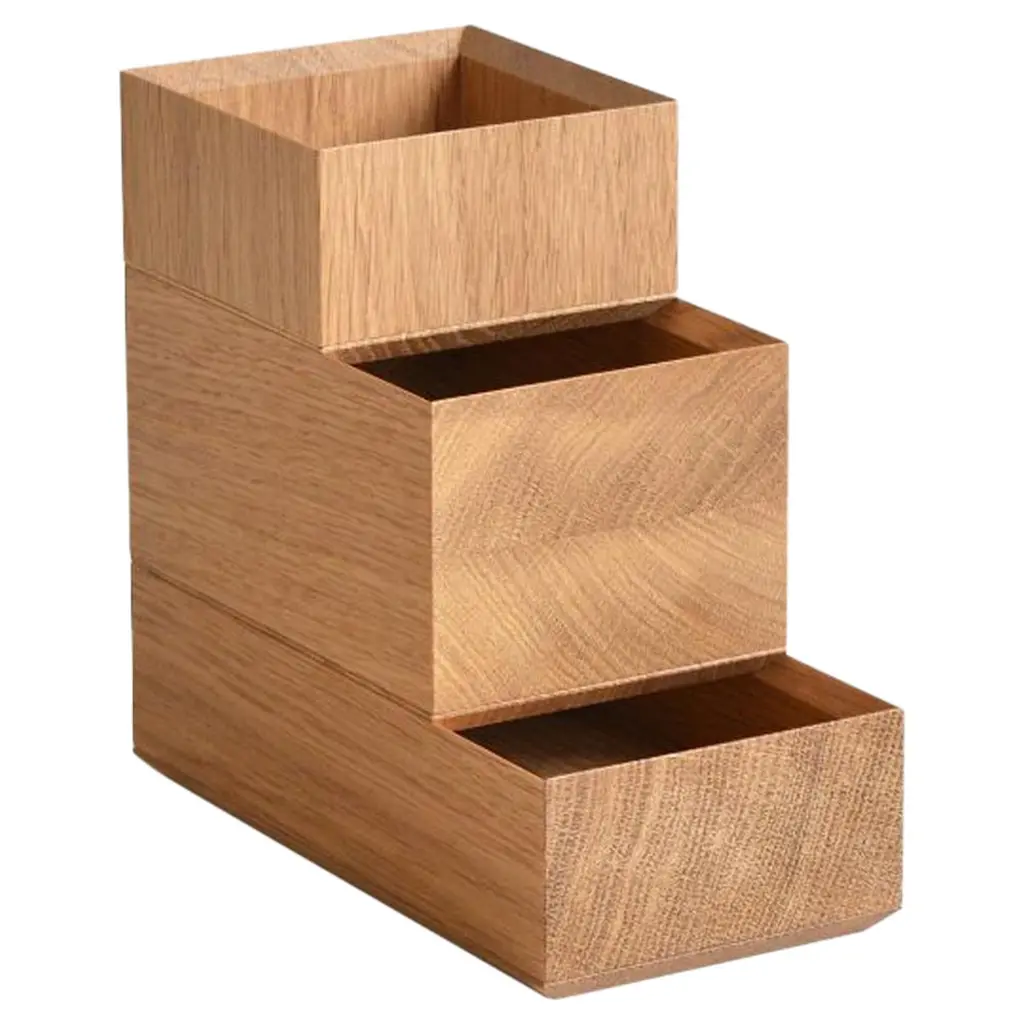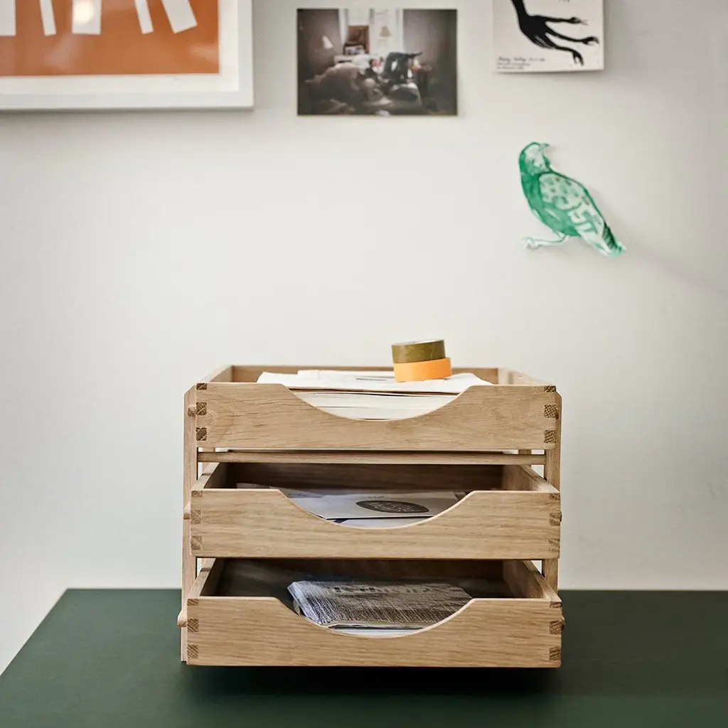 A letter tray with graduated levels in a classic and recognizable office expression with three functional oak trays, designed by VE2. For added flexibility, you can pull out a tray and take it with you when you work away from your desk.