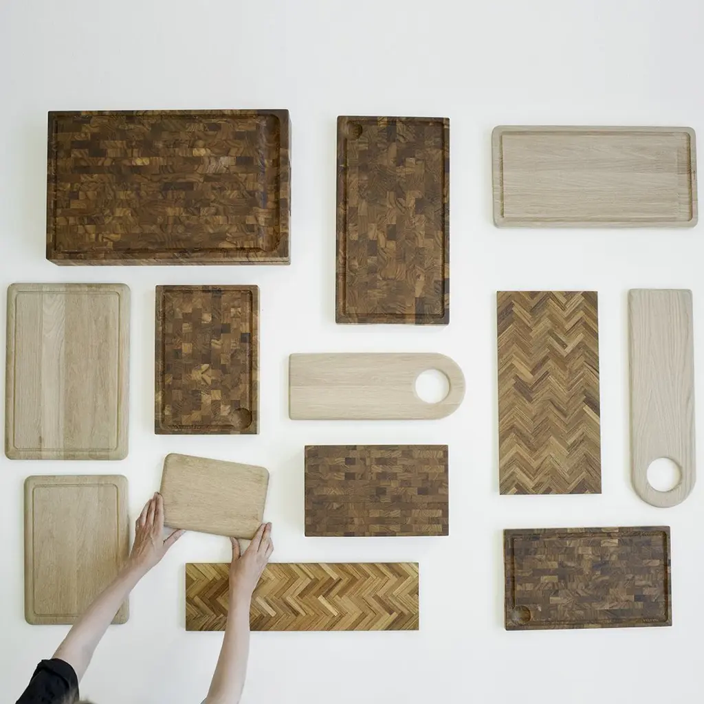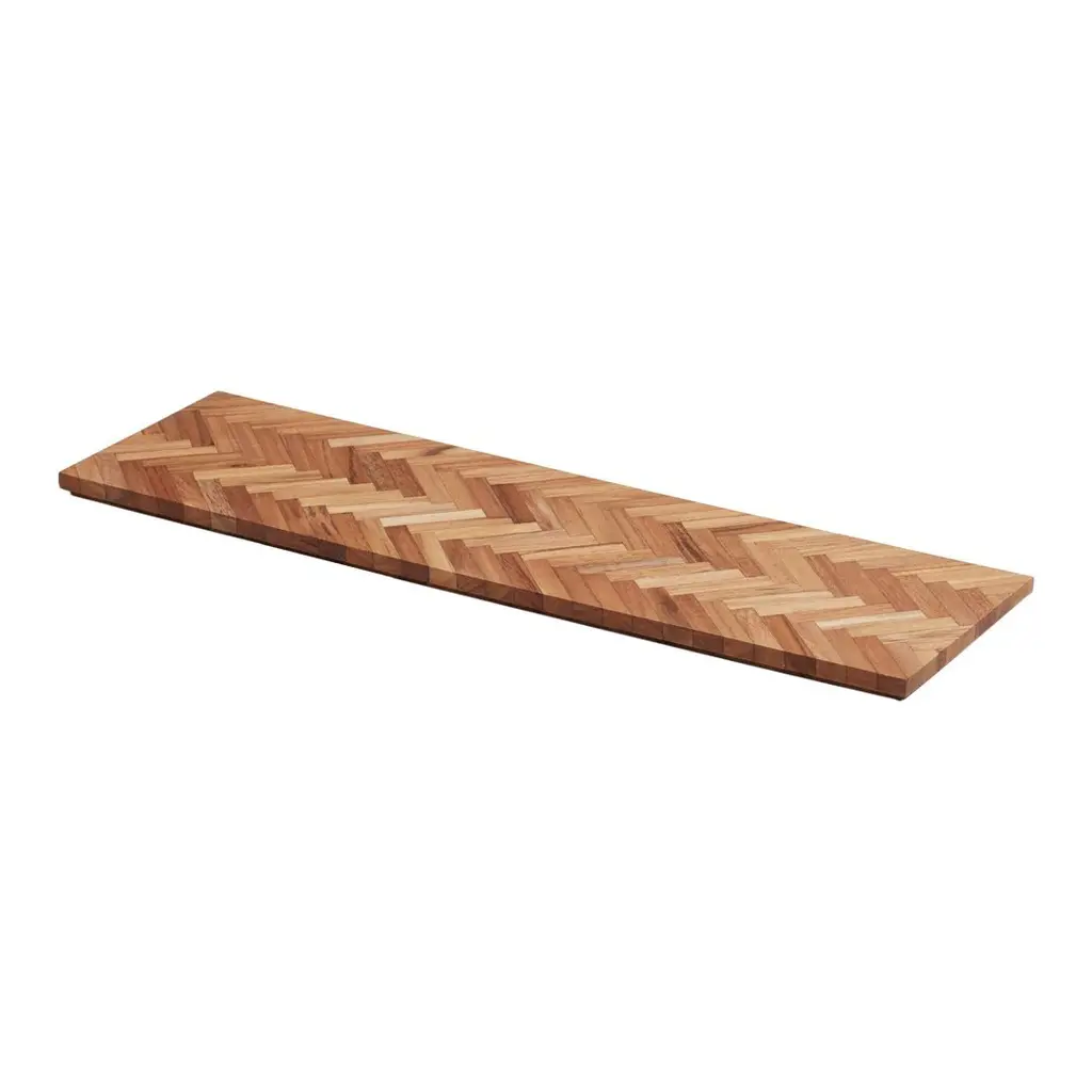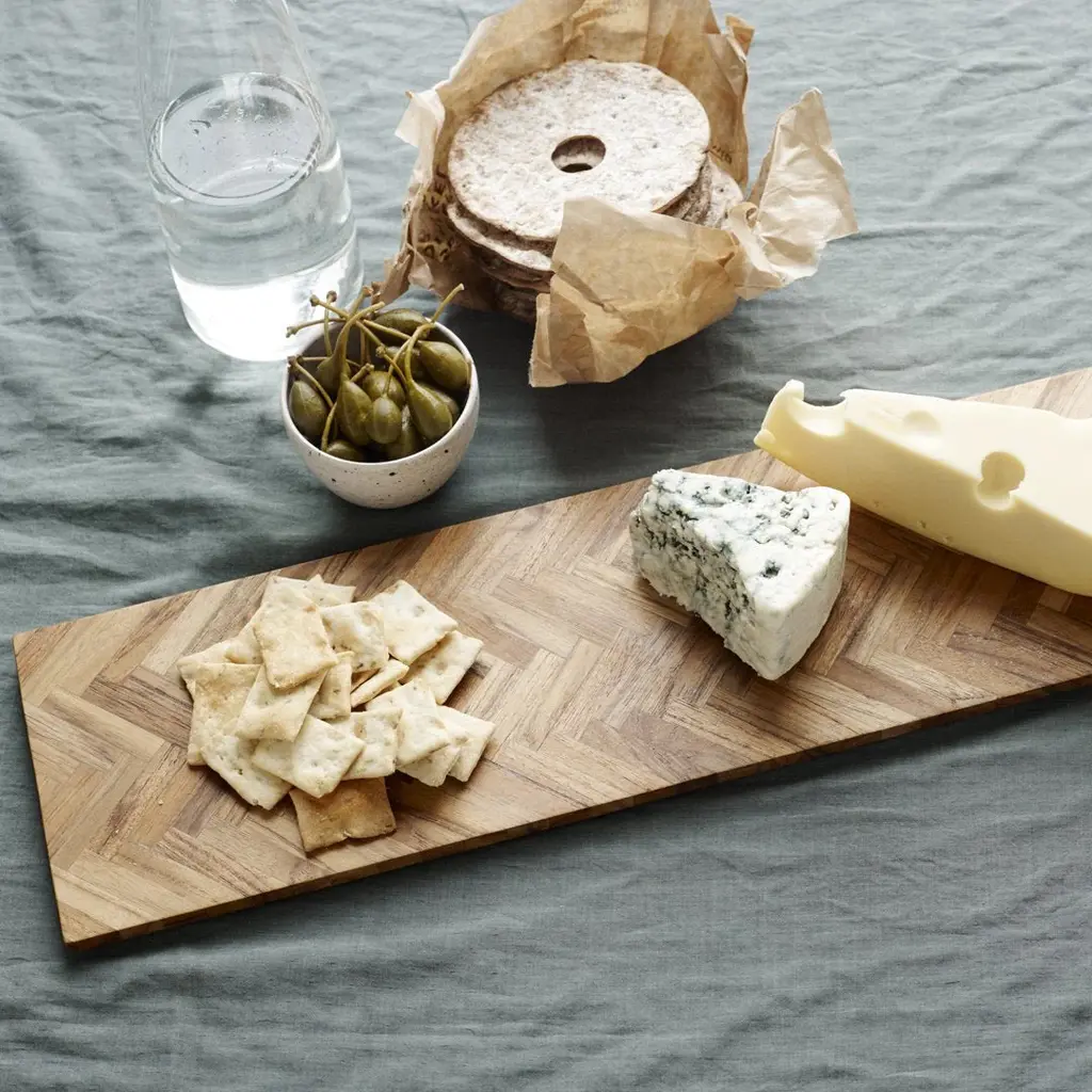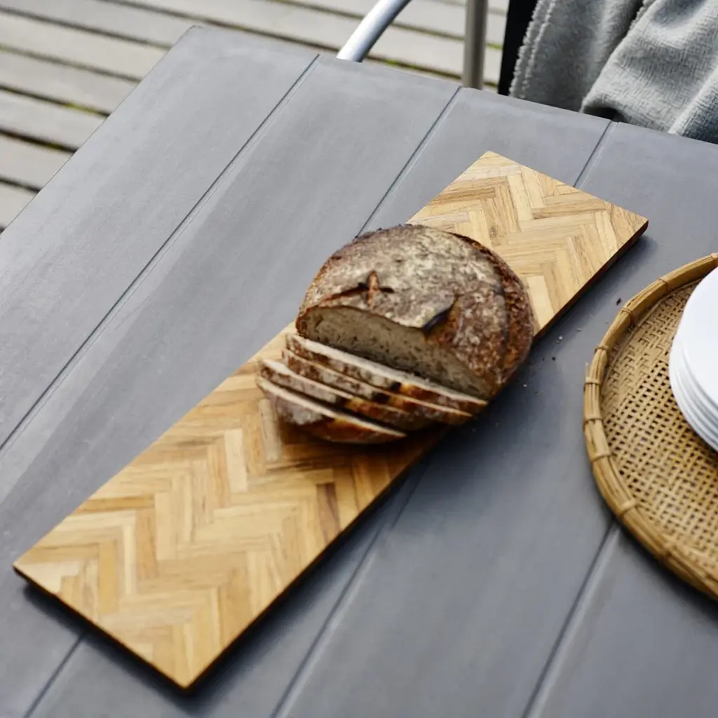 Sild Tray functions as a cutting board and serving board at the same time. The composition of small wooden sticks in teak forms an elegant herringbone pattern, emphasized by the many nuances and grains in the wood. ‘Sild' means herring in Danish, which explains the name. Sild Tray is designed with a small notch all the way along the edge, making it easier to lift up and put down.