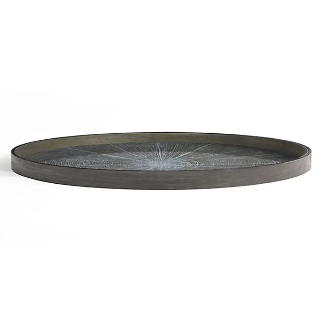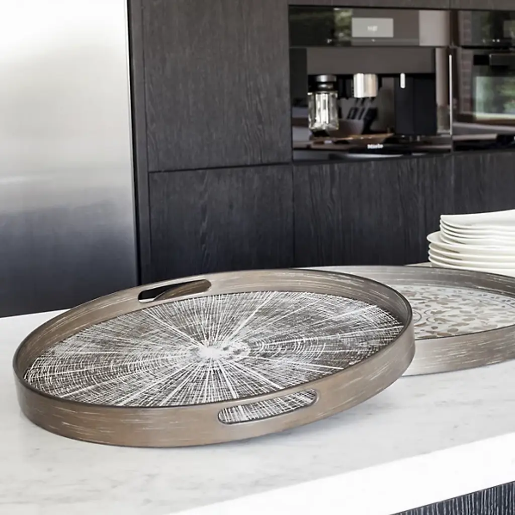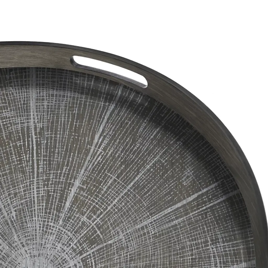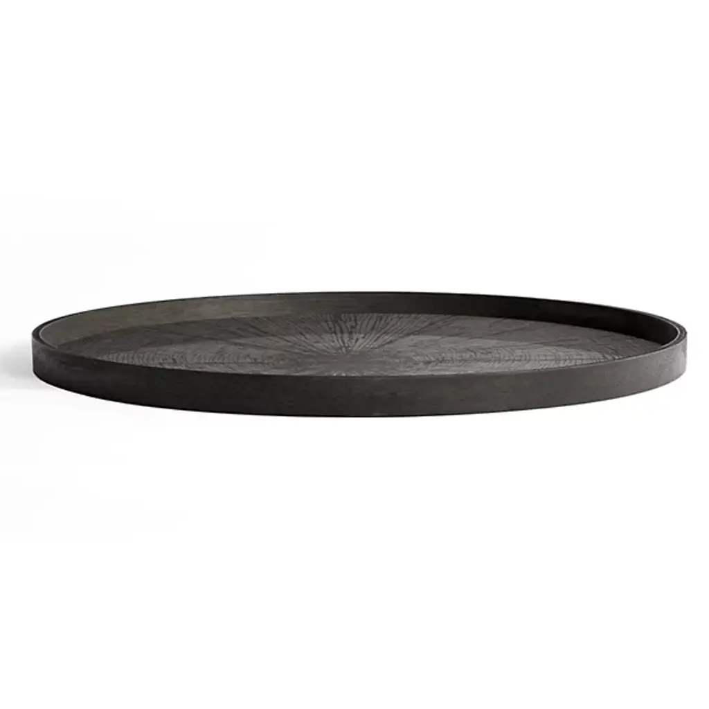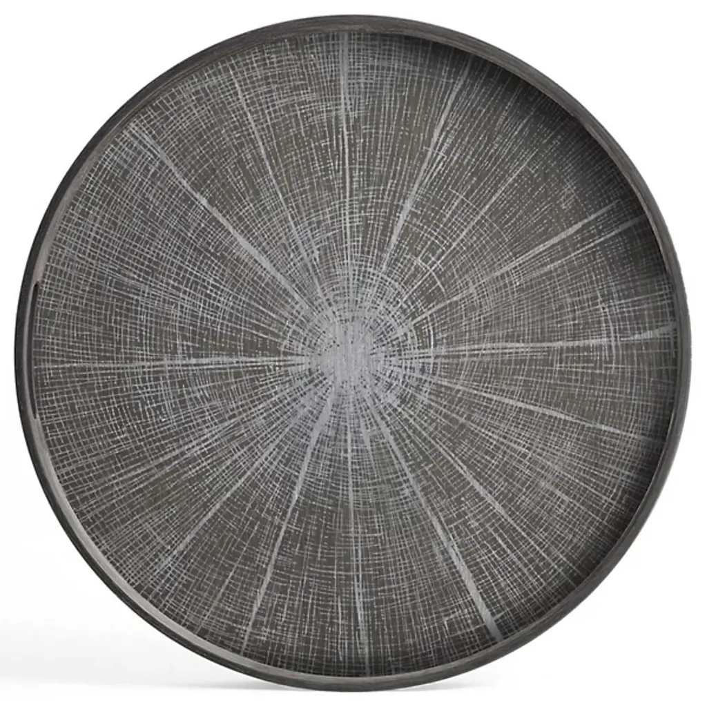 The Slice Round Wooden Tray from Ethnicraft boasts a circular shape and captivating pie-graph style depictions emanating from a central focal point, making it a functional work of art that's suited for both organizing and for display. Crafted from durable wood, this contemporary tray is built to withstand everyday use.