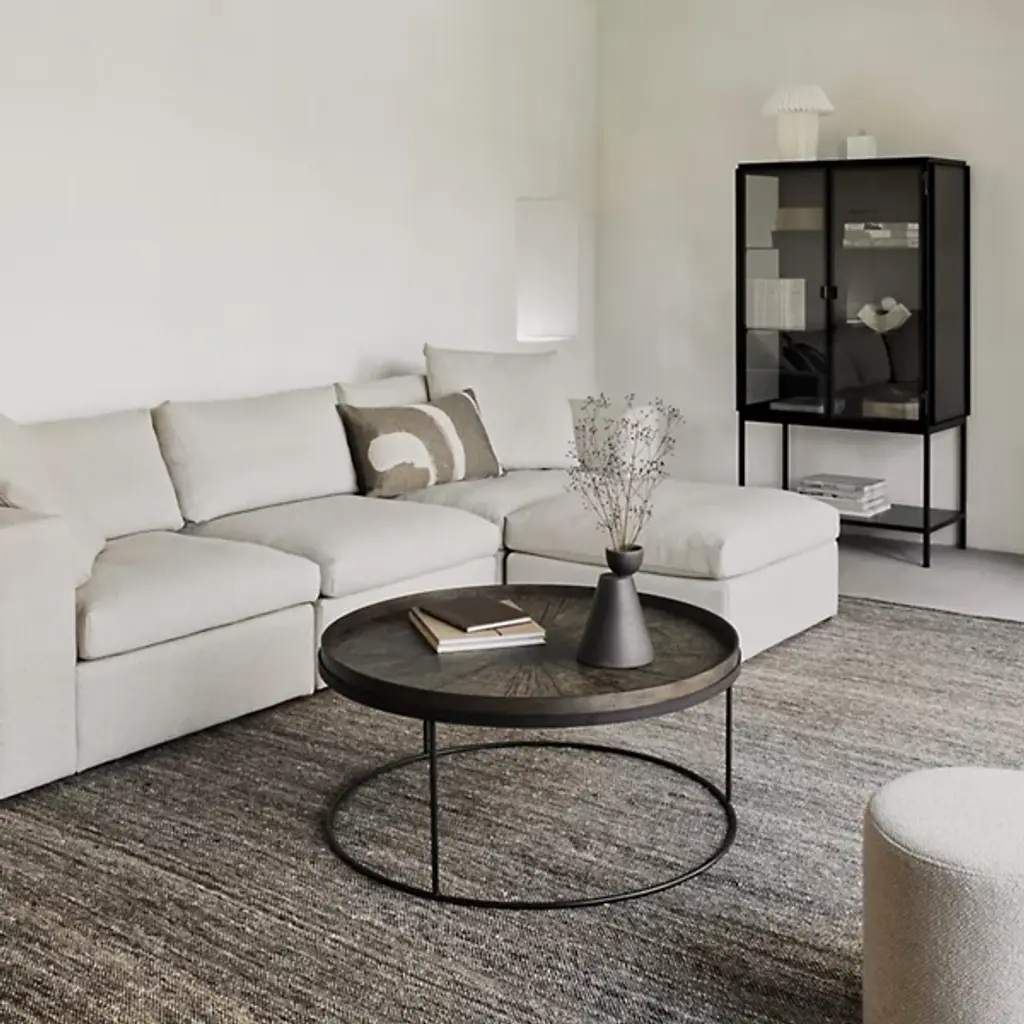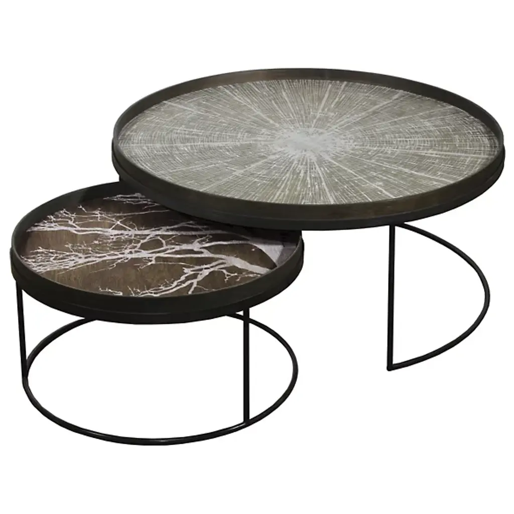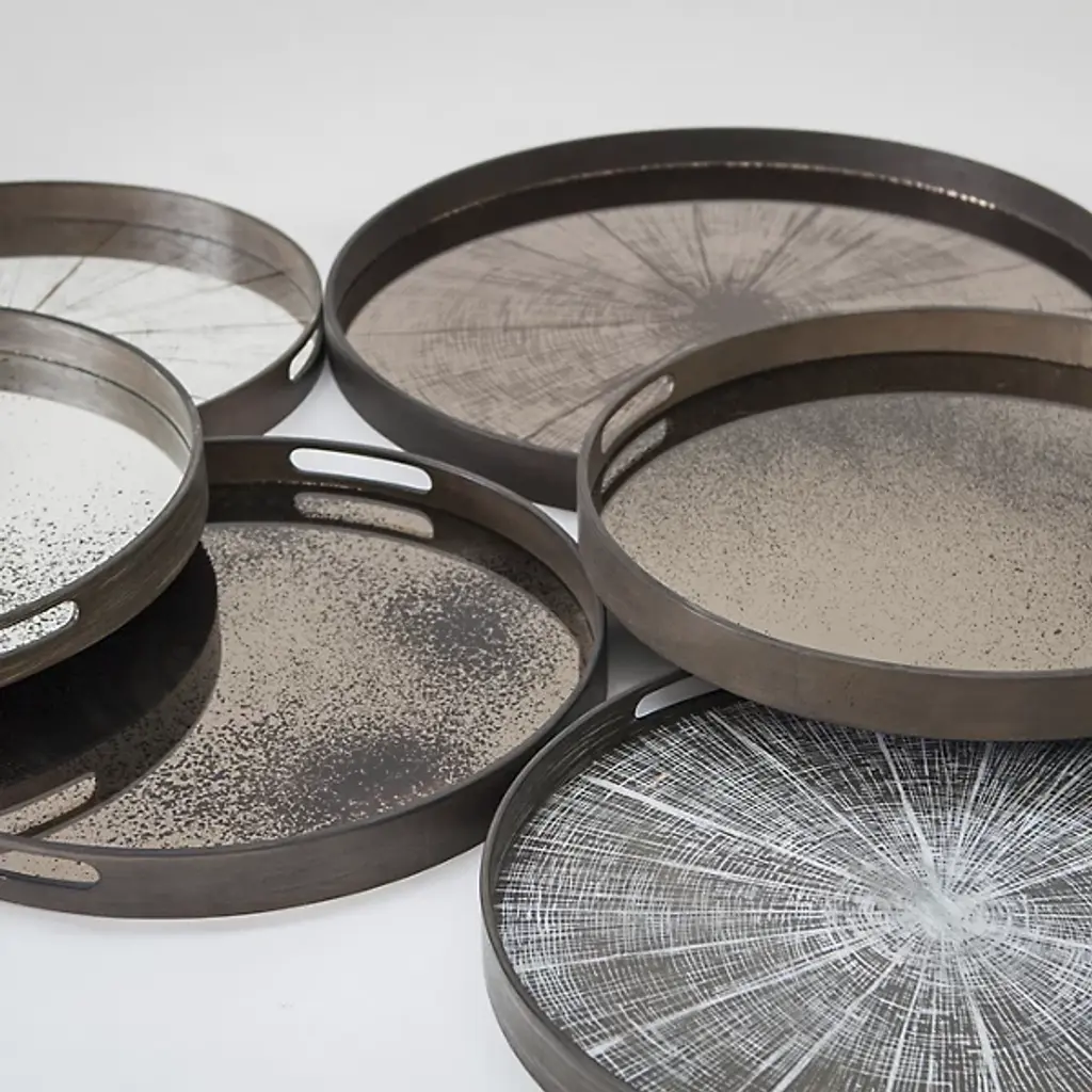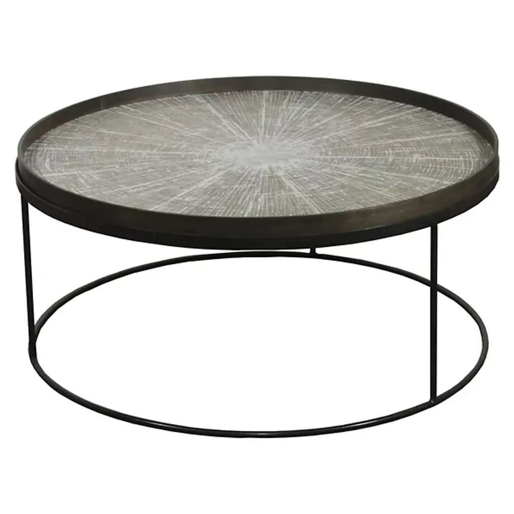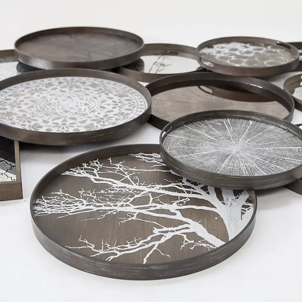 The Slice Round Wooden Tray from Ethnicraft boasts a circular shape and captivating pie-graph style depictions emanating from a central focal point, making it a functional work of art that's suited for both organizing and for display. Crafted from durable wood, this contemporary tray is built to withstand everyday use.