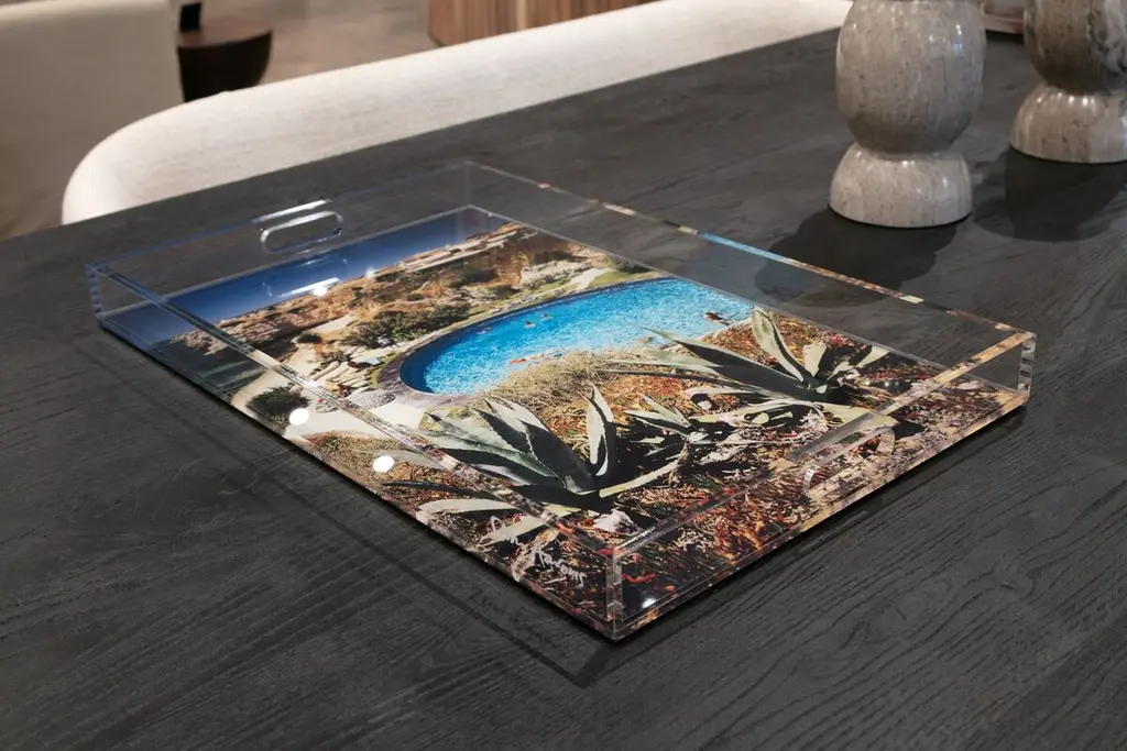 Slim Aarons's photographs of “attractive people doing attractive things in attractive places” bring a bygone glamour to any room, whether they're hanging on a wall or, as is the case here, featured on the bottom of an acrylic tray. This photo of the pool at Portugal's Algarve Hotel was taken in 1970. Handcrafted in the USA, the tray has handles for easy carrying and high sides to help prevent objects from falling off.