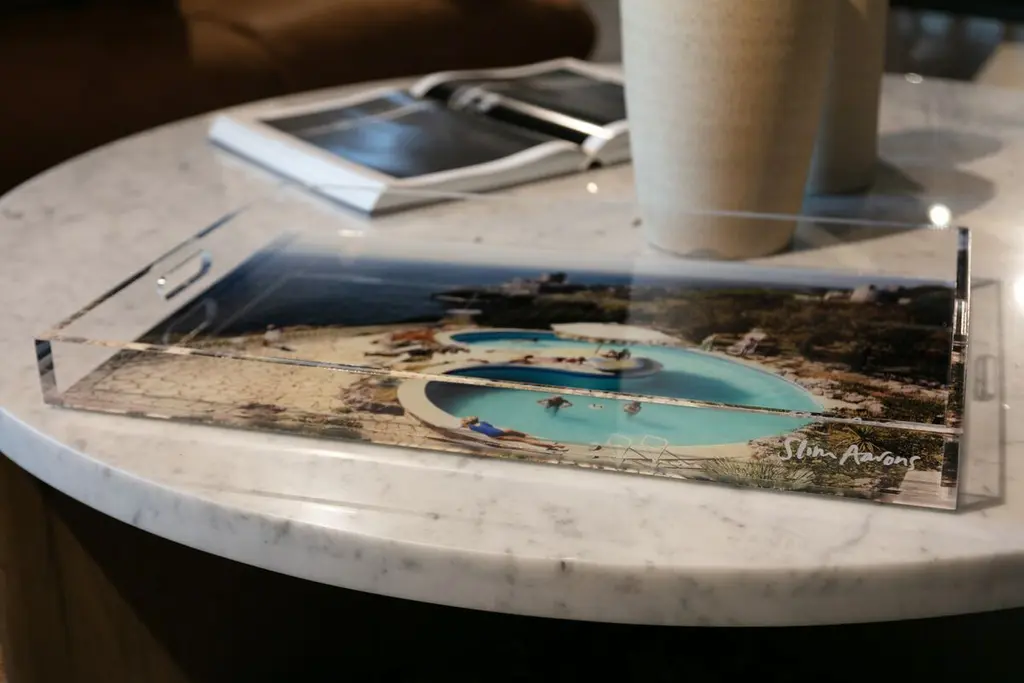 Slim Aarons's photographs of “attractive people doing attractive things in attractive places” bring a bygone glamour to any room, whether they're hanging on a wall or, as is the case here, featured on the bottom of an acrylic tray. Aarons took this photo of the pool of hotelier Lamberto Micangeli's Tuscan villa in 1986. Handcrafted in the USA, the tray has handles for easy carrying and high sides to help prevent objects from falling off.