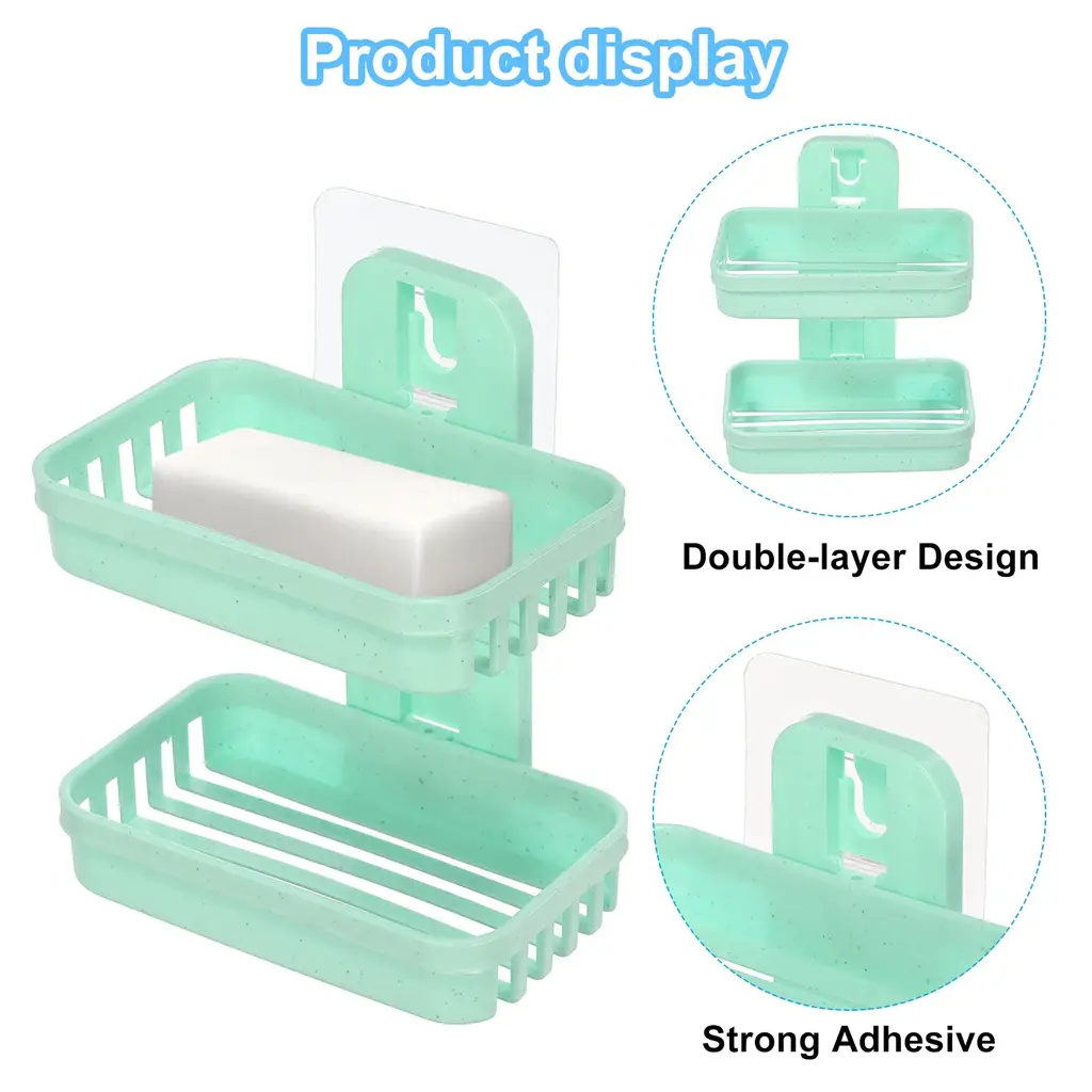 Keep your soap clean and organized with our Double Layer Soap Holder. Designed with convenience in mind, this portable soap container is perfect for bathroom, kitchen, and home decor.Specification Color: GreenMaterial: PlasticDimension: 130mm x 78mm x 26mm/ 5.1 inch x 3.1 inch x 1 inch (L*W*H)Packing List: 2 x Soap HoldersAdvantageMade from durable and lightweight materials, this soap holder is built to last, providing mess-free storage for your soap.Instruction1. Ensure that the surface where you want to install the soap holder is clean and dry. 2. Place the suction cup on the desired location, pressing firmly to create a secure seal. 3. Adjust the position of the soap holder as needed.NOTE: Please note that the soap holder is designed for use with bar soap, and it is recommended to allow your soap to dry before placing it in the container to avoid excessive moisture buildup.