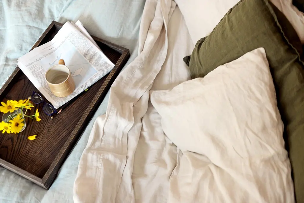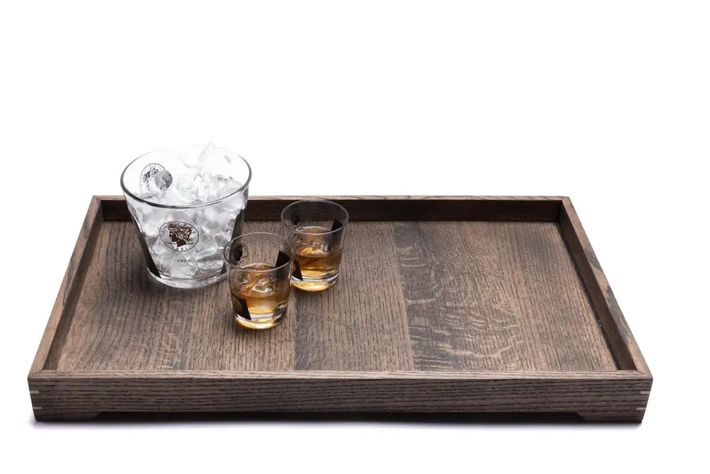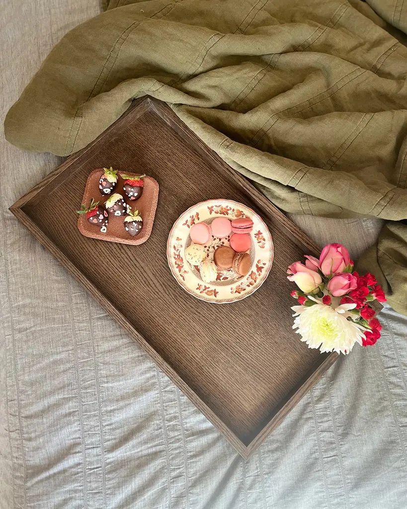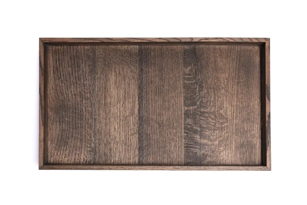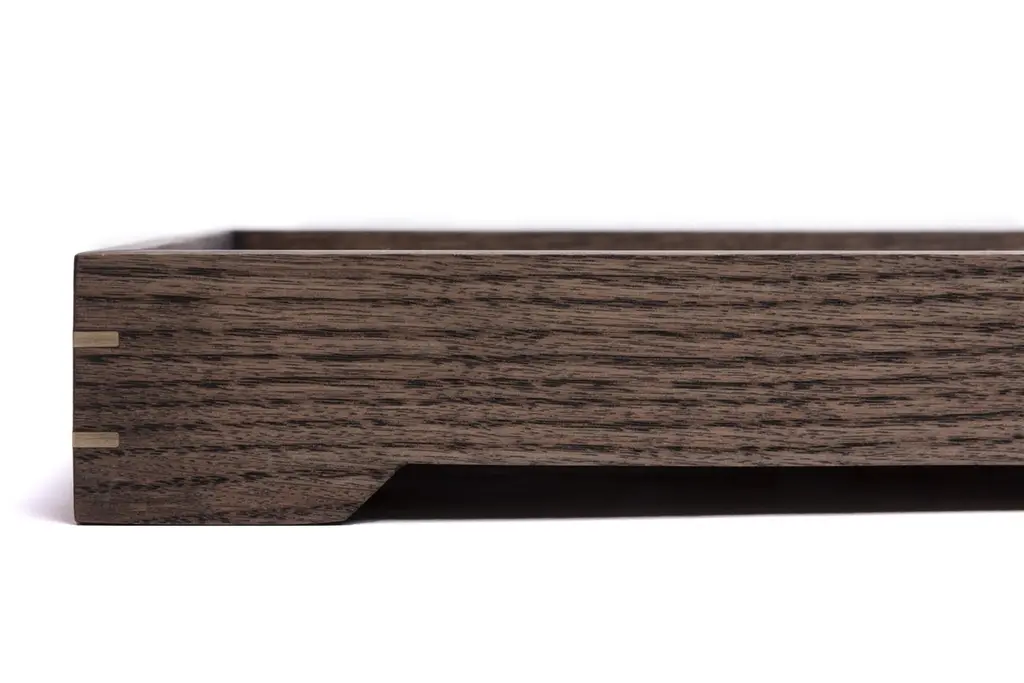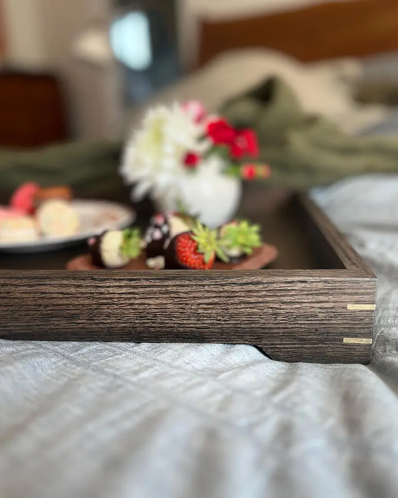 We made this modern ebonized oak wood and brass tray for lazy Sundays spent reading the paper with coffee and scones, but it would be perfect to use for hosting an afternoon tea, or as barware to pass out drinks at a cocktail party. When not in use, it makes a distinctive addition to any coffee table or ottoman in a living room or bedroom. Solid oak is given a hand-applied, ebony, black finish and joined with brass splines into a sturdy, well-crafted object. Whether it's the perfect way to complete your own breakfast in bed experience, or a gift for a housewarming party or bridal shower, this handcrafted wood and brass tray is sure to add warmth and comfort to the home. Due to the unique nature of each piece of wood, your tray will show varied coloring and grain. We use a hand-applied, all natural finish to enhance and protect the unique, urban timber grains, highlighting variation and one-of-a-kind nature. Remove food debris or moisture in a timely manner. Use a moist rag with water to clean. Solvents and chemicals will degrade the finish.