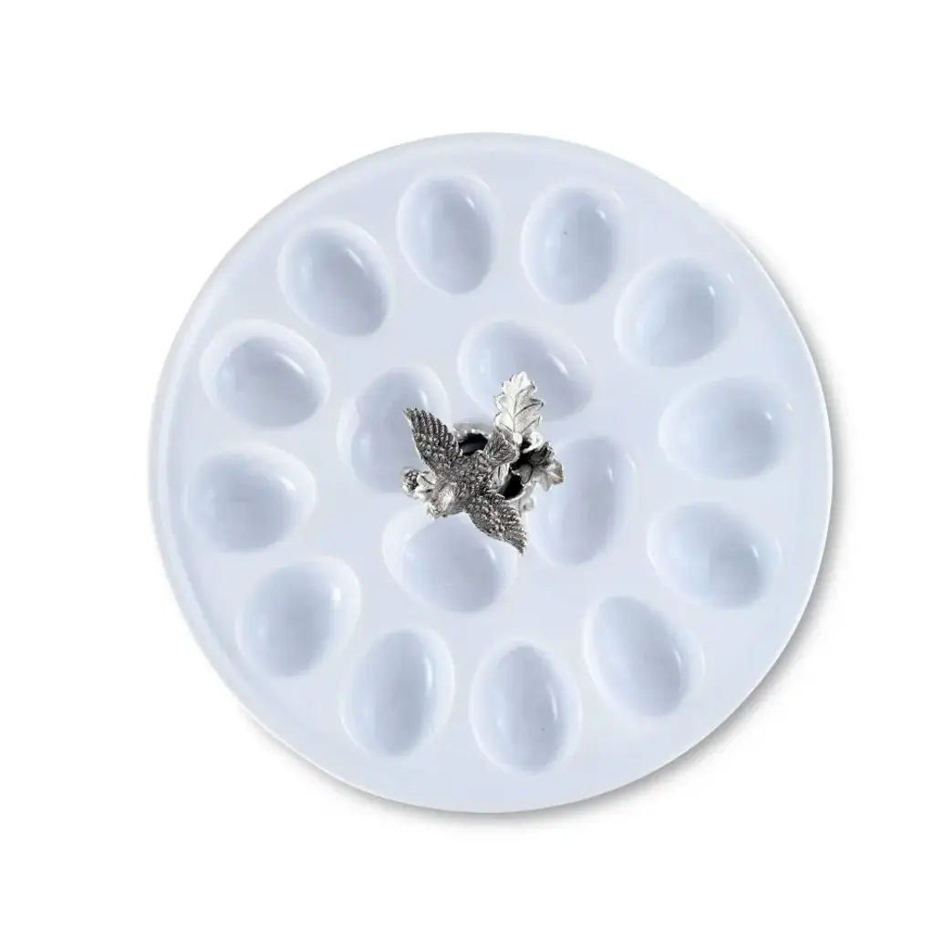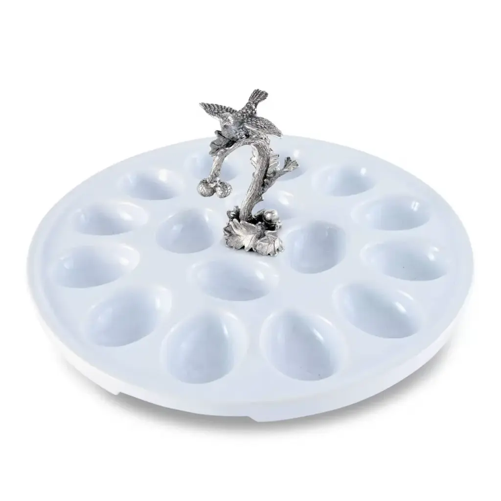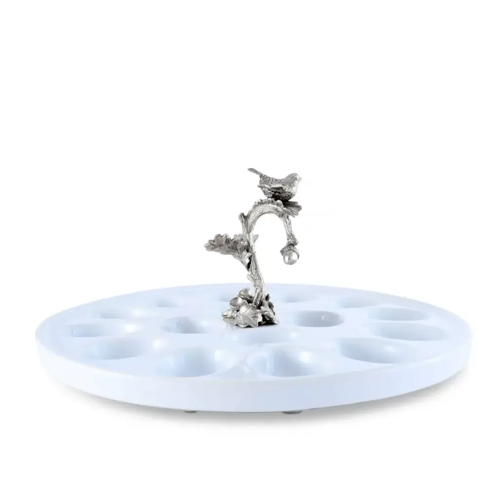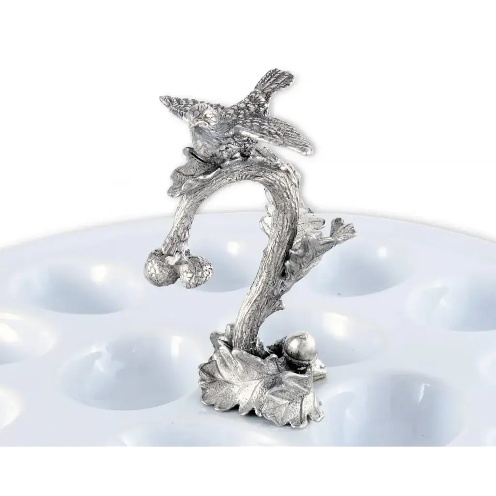 Watch dinner guests smile as they sample a tasty morsel from this Vagabond House egg tray. This small serving platter features a tiny songbird looking after its clutch of appetizers, and the lustrous, white finish provides a dramatic backdrop for eggs filled with a creamy yolk filling. Crafted using a hand-glazed, double-firing process, this stoneware tray's 16 oval-shaped depressions keep your eggs nestled in place. The server measures 10.5 inches in diameter and 5 inches tall, and it works well among an array of dishes or alone as an intriguing accent piece. The handcrafted pewter tree limb is strewn with leaves for an inviting natural display, and its chirpy resident looks perfectly at home amid your delectable offerings. Let this distinctive serving piece add a sprightly ambiance to your festive gatherings. Vagabond House is a family-owned American company specializing in fine pewter tableware, servingware and giftware. Largely inspired by nature, their exclusive products are designed to be unique, functional heirlooms for those who seek to express tradition and style in both family and formal entertaining.