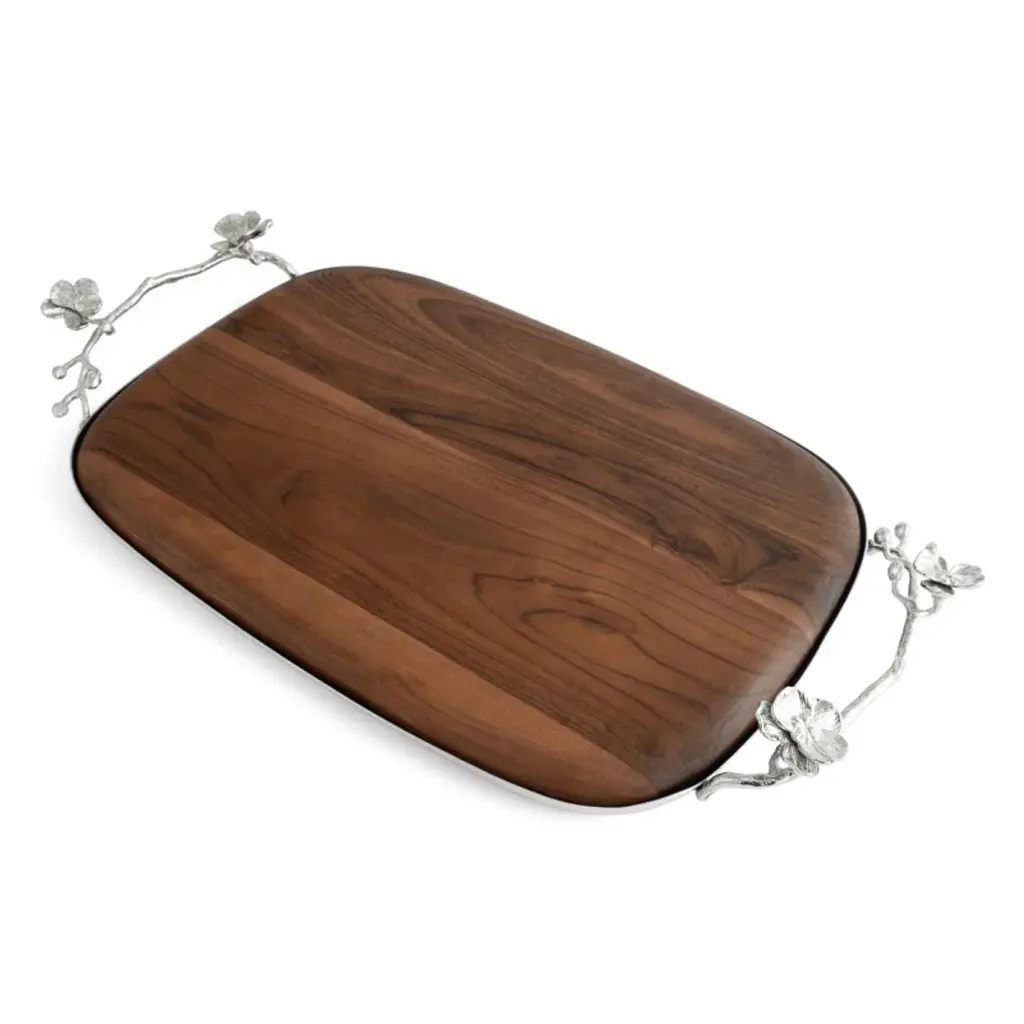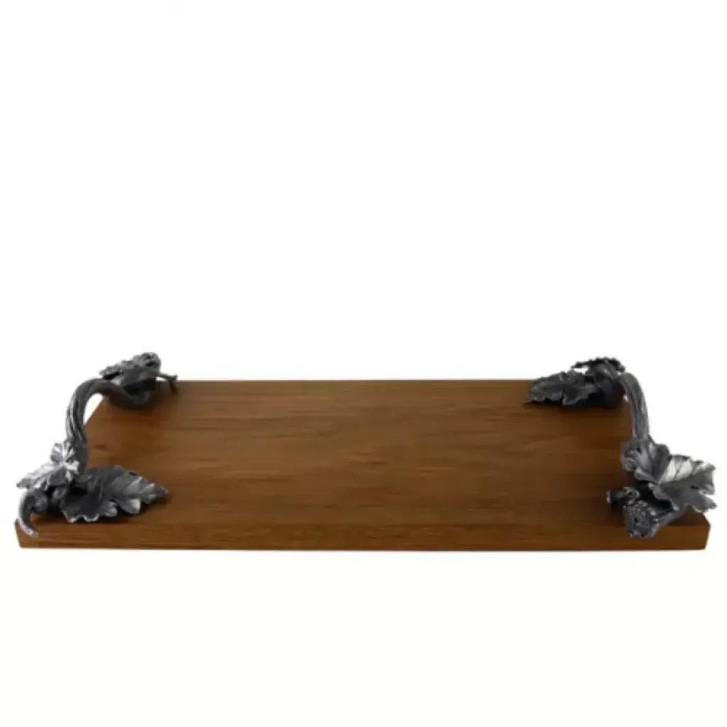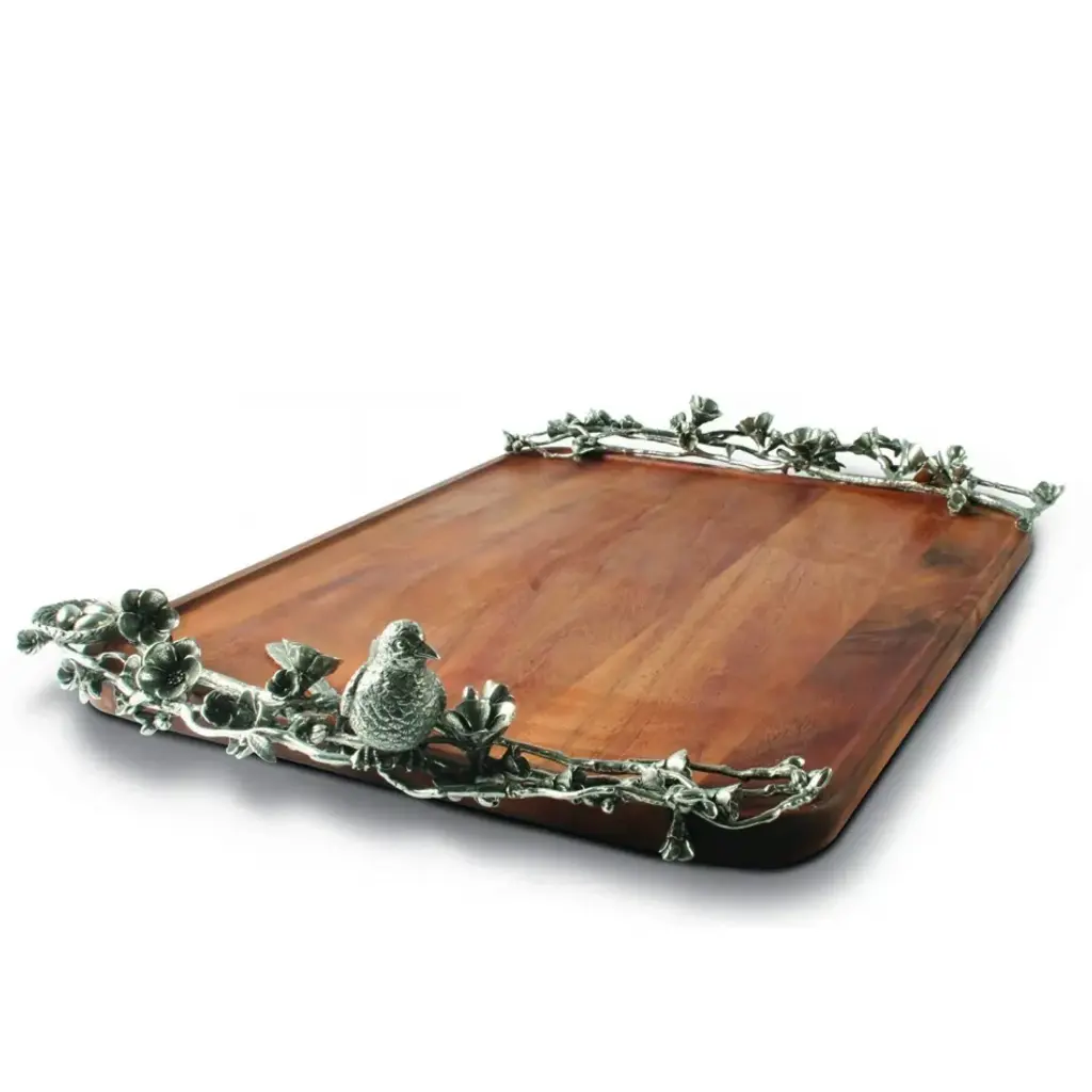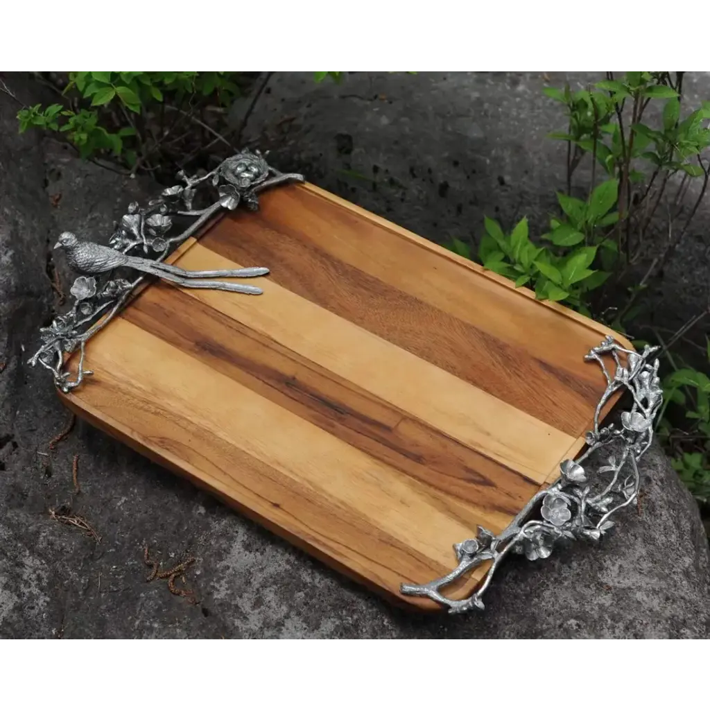 Your guests may break into songs of praise and delight when you serve with Vagabond House's generously sized acacia and pewter Song Bird serving tray. Created from lustrous, water resistant acacia grown only for Vagabond House, the uniquely chatoyant board is a true work of art. Exclusive and intricately detailed cast pewter sweet figural song birds and bountiful blooms embellish the handles of this heirloom quality tray. Vagabond House is a family-owned American company specializing in fine pewter tableware, servingware and giftware. Largely inspired by nature, their exclusive products are designed to be unique, functional heirlooms for those who seek to express tradition and style in both family and formal entertaining.