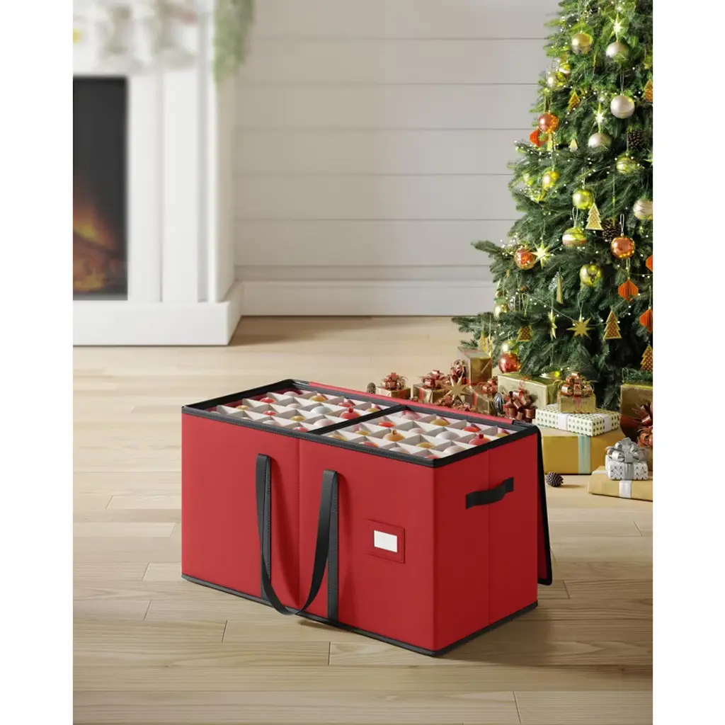 Specifications: Color: Cherry Red Material: Oxford Fabric, PP Plastic (Polypropylene) Product Size: 26"L x 13.4"W x 13.4"H (66 x 34 x 34 cm) Product Weight: 6.8 lb (3.1 kg) Max. Static Load Capacity: 11 lb (5 kg) Package Contents: 1 x Christmas Ornament Storage Box 8 x Tray 48 x Divider