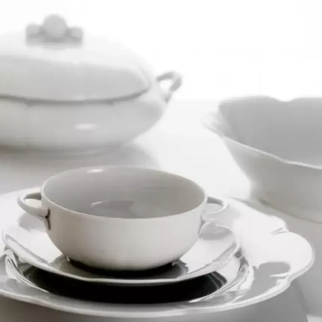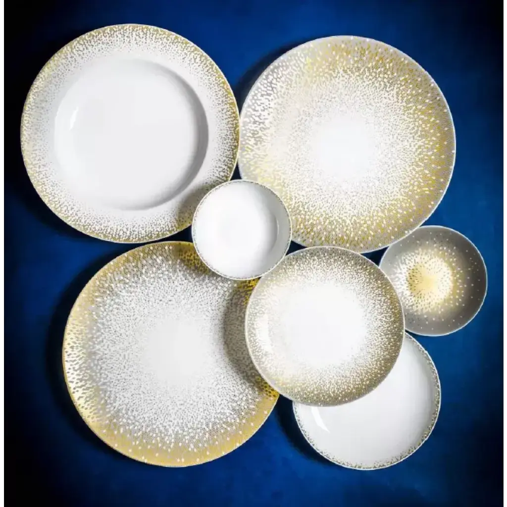 Like a shower of shooting stars, “Souffle d’Or” is an enchanting and sparkling collection. It takes you on a journey of stars in motion, which gather then scatter, resembling a radiating and spreading breath, from plates to teapots and vases. This iridescent grey and matt gold constellation narrates the know-how and technical skills of the renowned Maison Haviland. It will enchant your table decorations and homes with dreams, elegance and finesse Haviland Porcelain was founded by David Haviland, an American who moved from New York to France after he was brought a broken tea cup to match and recognized the quality and color of the old piece of porcelain. Filled with curiosity, he went to France to find the factory where the cup had been made, but the samples he was sent were not up to his standards. So in 1841, he moved to Limoges to set up his own factory. Traditional French dinnerware was usually produced in Limoges and sent to Paris for decoration. Haviland insisted on setting up a studio within his factory to have more control over the designs. Renowned artists, including Cocteau, Dali, and Kandinsky have played a role in the company's designs. Today, Haviland is one of the premier names in French porcelain dinnerware, sought by collectors all over the world. Clients have included the White House, Empress Eugenie, General de Gaulle, Jacques Chirac, the Emperor of Japan, and the Royal Court of Morocco.