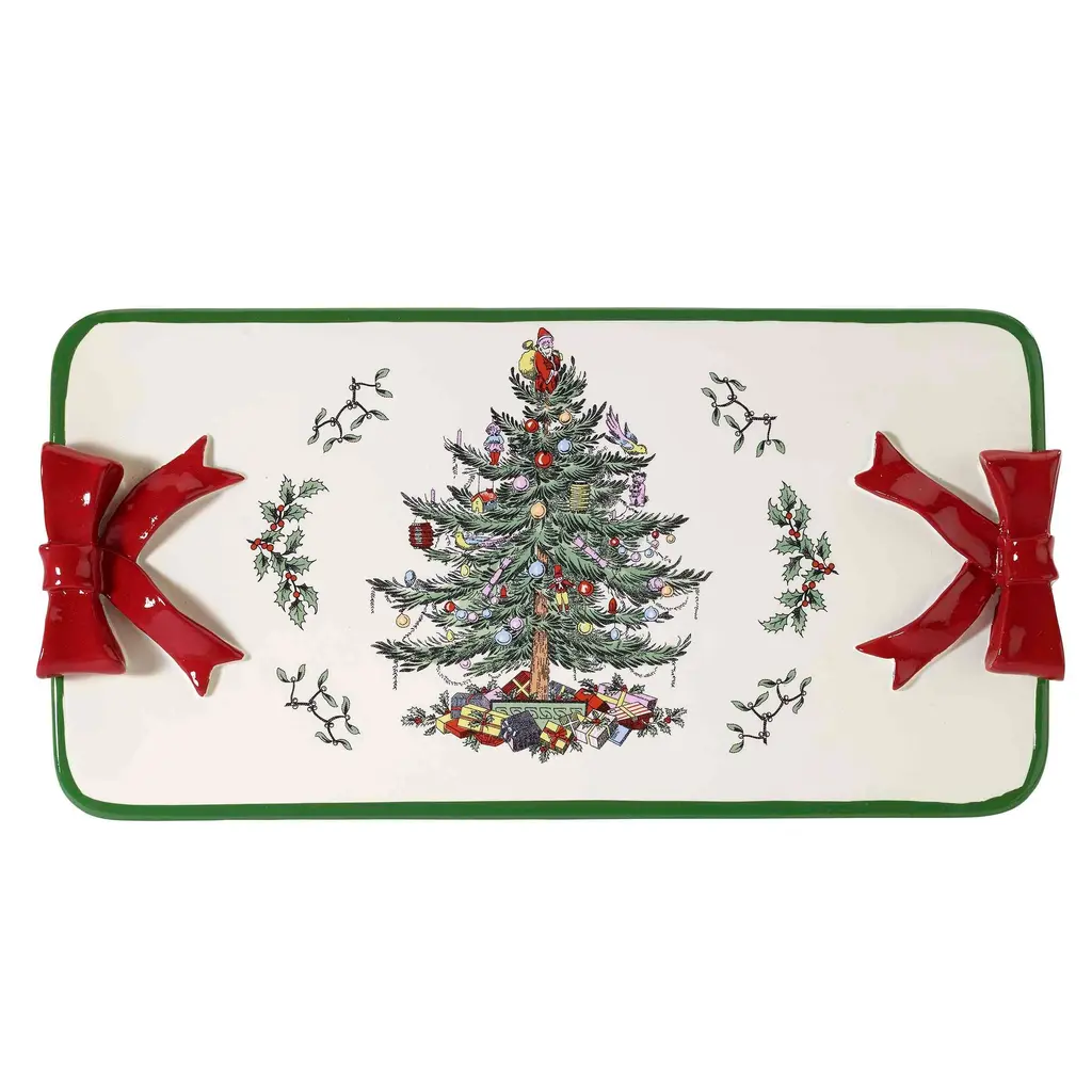 The Spode® Christmas Tree Vanity Tray features the iconic Christmas tree with holly on either side on an ivory base. Finished with raised, dimensional red ribbons on both ends & green top edge and side. Made of durable, hand-painted resin. Matching shower curtain, rug, towels ,accessories available.