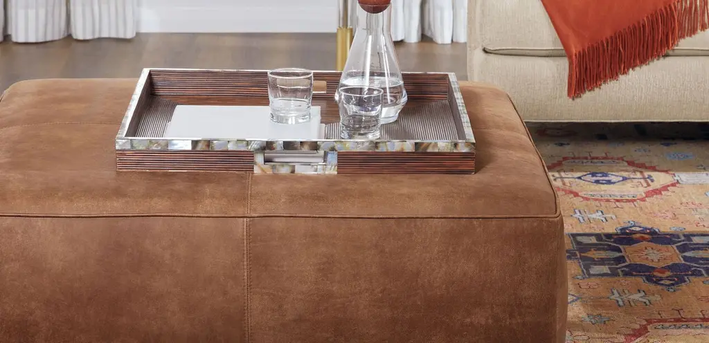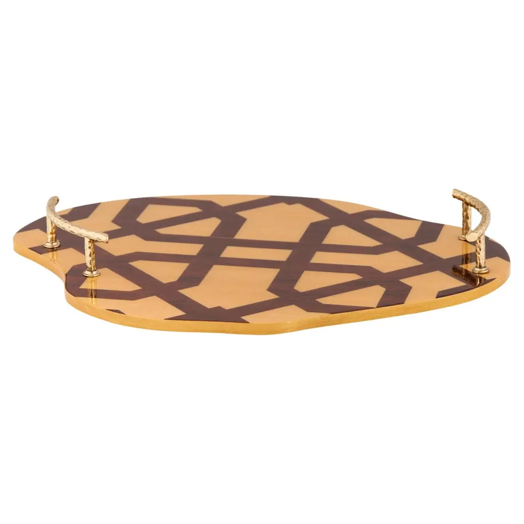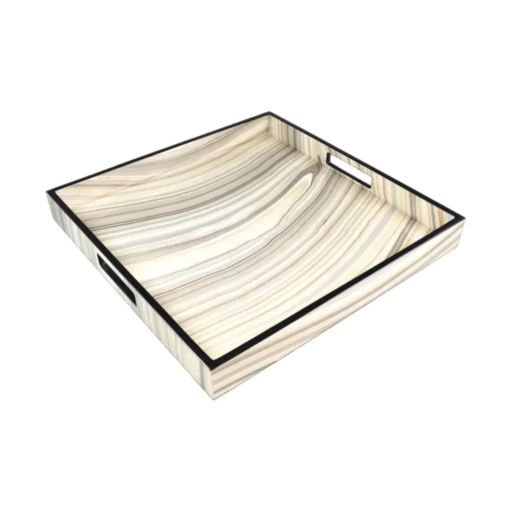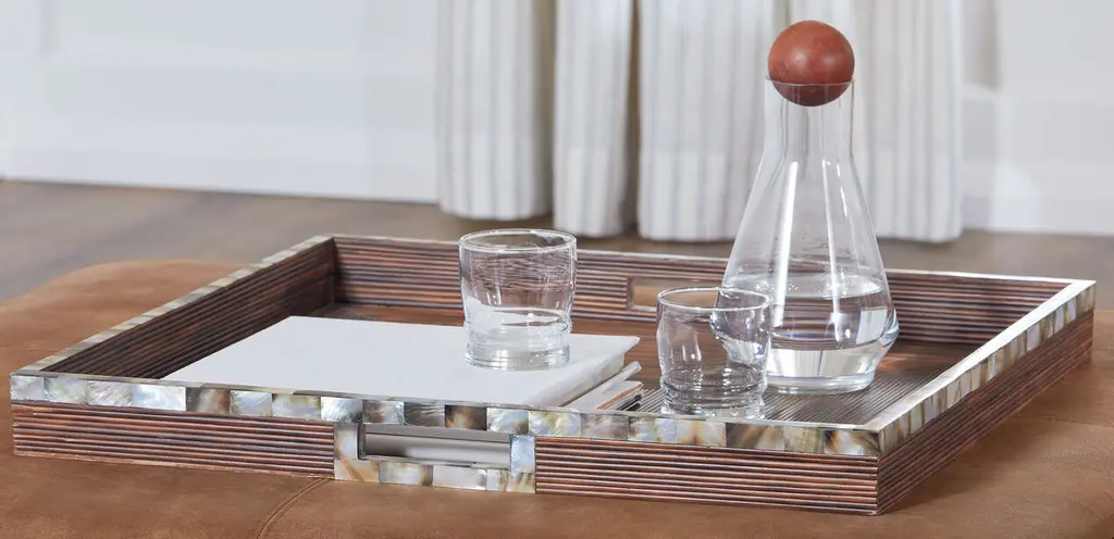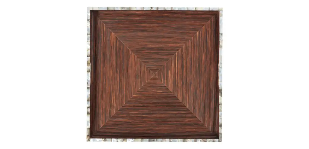 Artisans choose, cure, cut, and bond pieces of sugarcane to create this large decorative tray's concentric square-patterned bottom and slant-patterned sides. Finished with a beautiful rim and handles made with decorative shell, it's sized to look stunning on a cocktail ottoman or large coffee table.