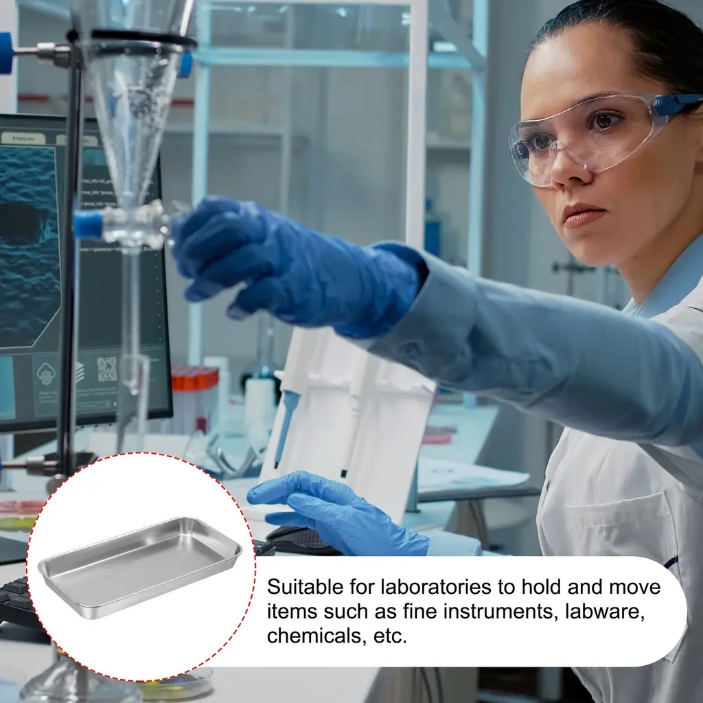 The tray is suitable for laboratories to hold and move items such as fine instruments, labware, chemicals, etc.SpecificationColor: SilverShape: RectangularMaterial: 201 Stainless SteelInside Height: 3.5cm / 1.38 inchOutside Dimension: 15x10x4cm / 5.91x3.94x1.57 inch (L*W*H)Package Content: 1 x Tray with CoverAdvantageMade of well-polished stainless steel with high hardness, certain corrosion resistance, high rust resistance, and easy to clean.InstructionUse a scouring pad to clean it with warm water, and then rinse it twice with clean water.NoticeDo not use steel wool or the like for cleaning, which will easily break the passivation protective film on the surface of stainless steel.