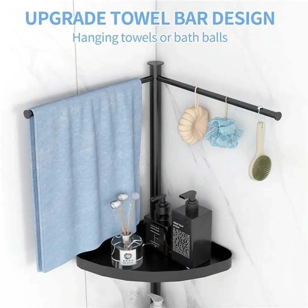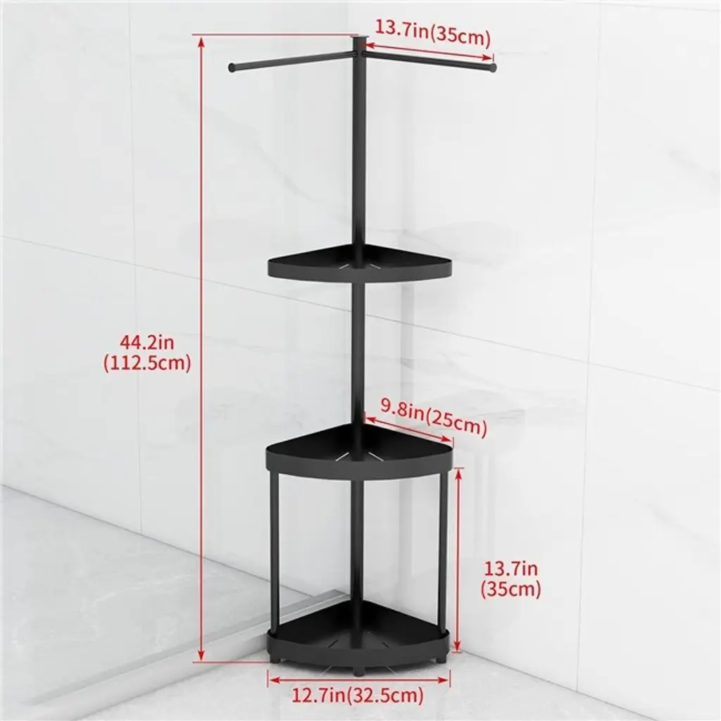 CORNER PLACEMENT, SPACE SAVING - This vertical shower caddy is especially suitable for placing in the corner of the bathroom or toilet, which can make full use of the space and avoid occupying too much area. Its compact design makes the whole environment look more neat and organized, adding comfort and convenience to your home life. NEW 2-in-1 DESIGN - This bathroom shower rack consists of three tiers of storage space and two towel bars on top. The three-tier tray can be used for daily necessities such as shampoo, body wash, soap, etc., while the towel bar on the top is convenient for hanging towels or bath balls, providing a wealth of storage options. PREMIUM STAINLESS STEEL - The shower bracket in the shower enclosure is made of high quality stainless steel for excellent corrosion resistance and durability. It is not only strong and durable, but also easy to clean and maintain. It maintains a bright and clean appearance for a long time and still lasts well in humid environments. WATERPROOF AND ANTI-CORROSION - Each tray is designed with hydrophobic holes, which can effectively prevent the accumulation and penetration of water droplets, avoiding rust and corrosion problems. In addition, the foot pads on the bottom not only have good anti-slip performance, but also increase the distance to the ground, reduce the contact with the ground moisture and accelerate the drying. PRODUCT DIMENSIONS - The overall dimensions of the vertical corner shower caddy are 44.3 inches high x 13 inches long x 9.6 inches wide with two 12.4 inches extended towel bars and 13.7 inches spacing between each shelf. The large capacity is perfect for holding toiletries for the entire family.