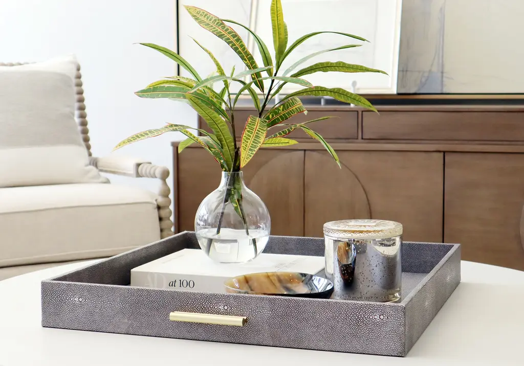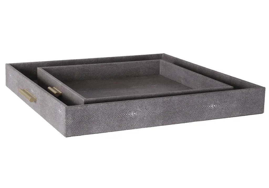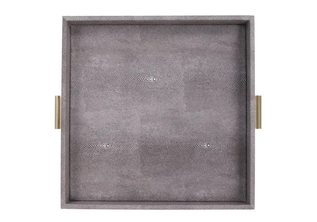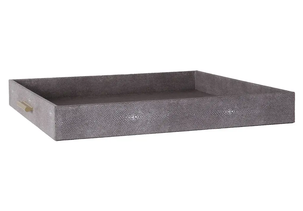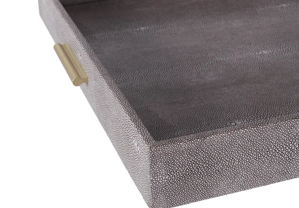 Final Sale The Sting Tray is a handsome, versatile piece with its muted slate amethyst color, textured shagreen design, and two opposing brass handles. Its spacious form easily styles with books, beads, and tabletop decor.