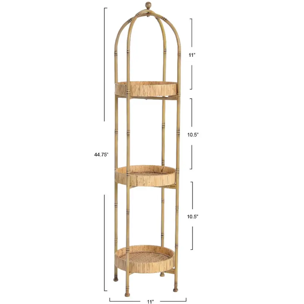 Elevate any living space with this shelf or plant stand, the perfect blend of functionality and style. Whether you're a plant lover or simply looking to add charm to an existing interior design scheme, this small yet sturdy shelf is sure to impress. Crafted with a durable iron frame and three natural rattan trays, this plant stand offers a unique touch to any room. The frame and natural rattan trays make this a versatile addition to any decor style, seamlessly fitting into Coastal, Contemporary and Boho Modern aesthetics. With its removable rattan trays, this plant stand allows easy rotation of plants or decorative items, providing the freedom to create a fresh and ever-changing display. Plus, assembly is quick and easy, with no tools required. Measuring at 11 inches in diameter and 41.75 inches high, this plant stand fits nicely in even the smallest of spaces.
