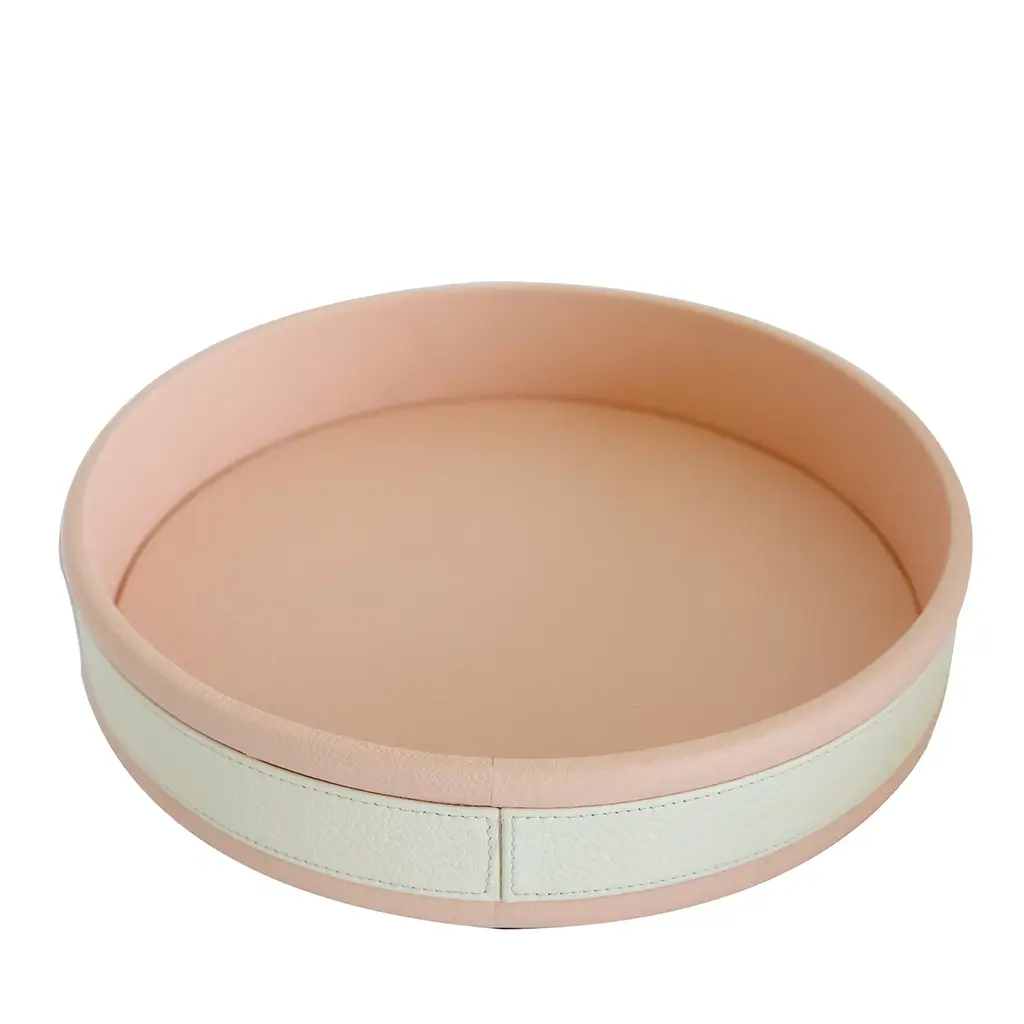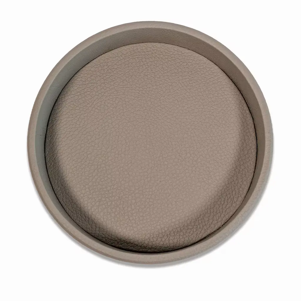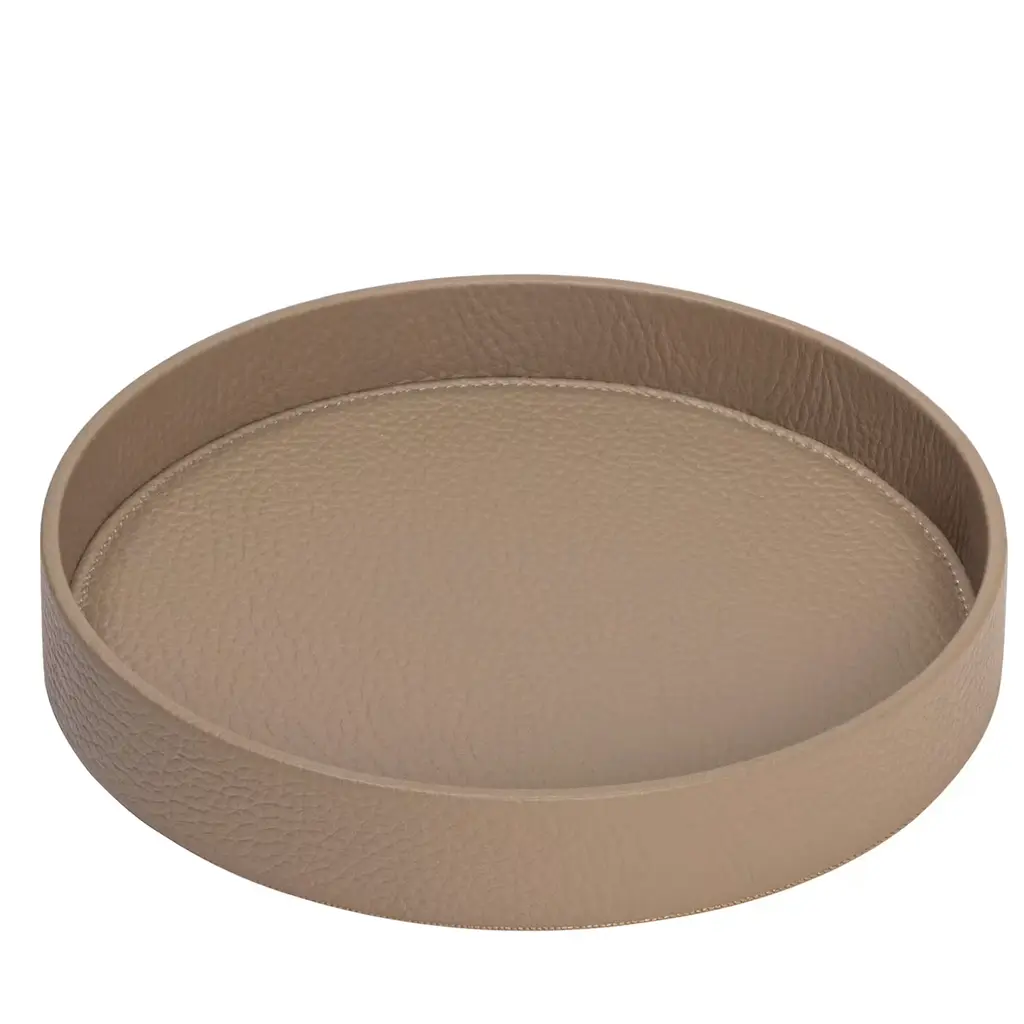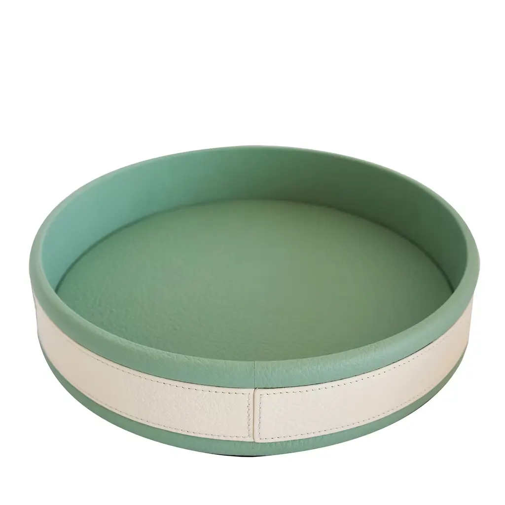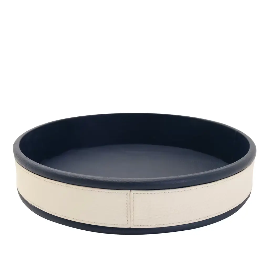 Handmade round tray dressed in fine and soft genuine grain leather. Available in 13 different colors mix. Please, ask the Concierge for further details.