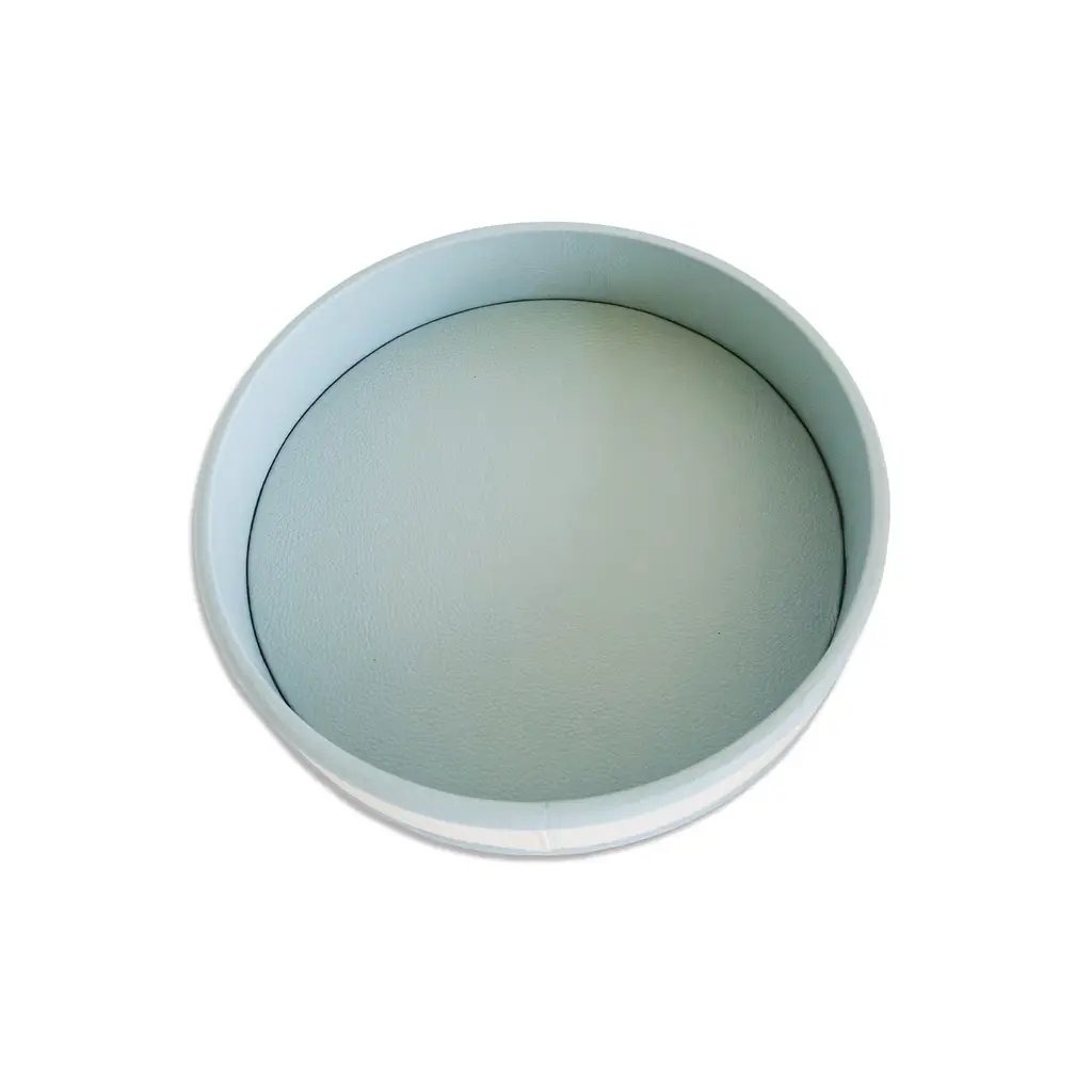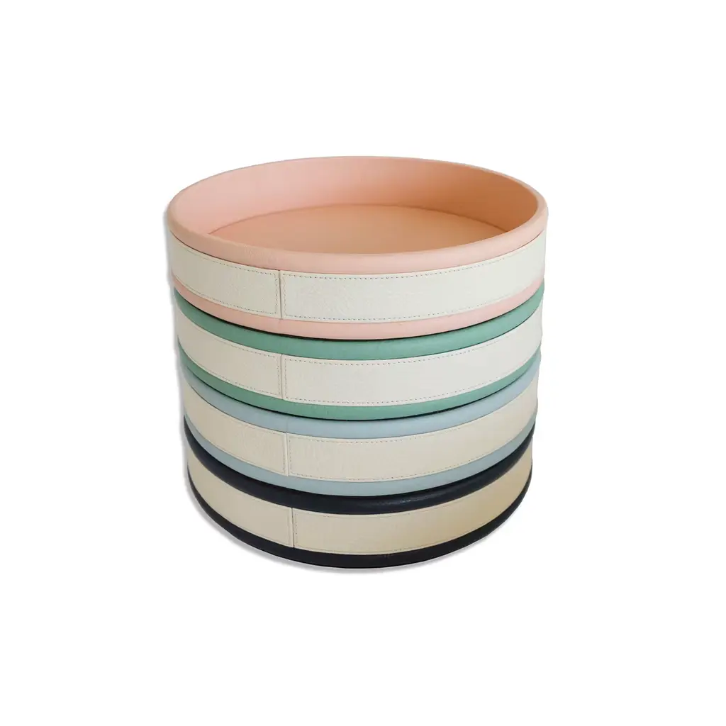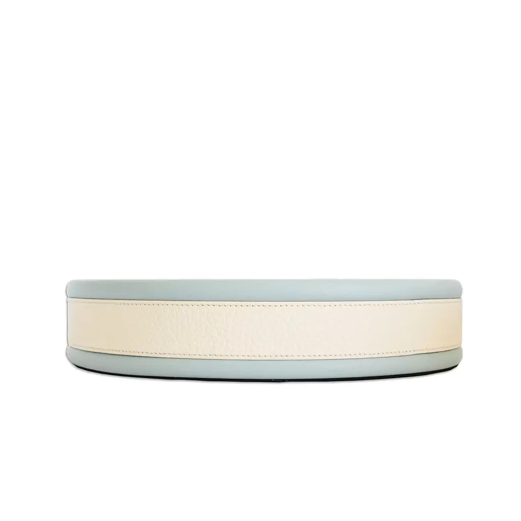 A delicate and elegant design from the Strips series of round trays, this exquisite piece combines a pastel. light blue hue with a neutral, harmonizing white. Handcrafted, it is covered with precious and soft full-grain leather. Customizable in color to suit any taste or decor need, it is available in six different combinations upon choice, please check the Artemest catalog for details.