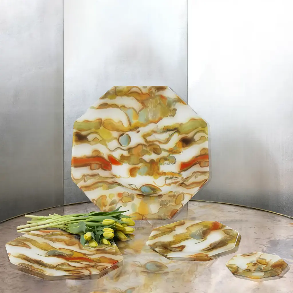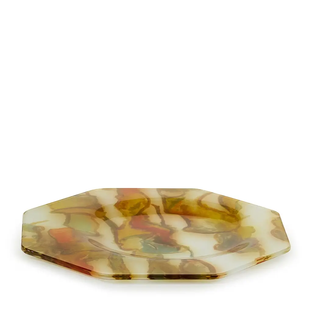 The perfect tray-shape is to be held with one hand to be filled with refined finger food. The octagonal shape is asymmetrical with a larger brim for a secure grip. The hollow base is off-center for perfect balance. The crystal-clear material used, methacrylate, is fused together with printed organza, thermo-formed, and finished by hand. Food-certified, impact resistant, dishwasher safe, stackable, handy, and of great impact.