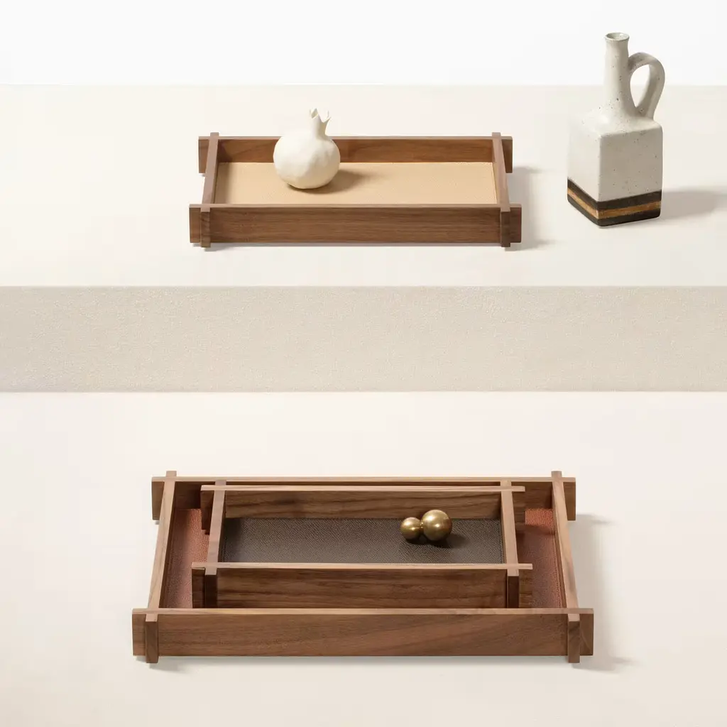 This wood brown valet tray stands as a testament to refined elegance and craftsmanship. Defined by its minimalistic design and distinctive "L" shaped corners, this large tray seamlessly fits into any space. The harmonious blend of luxurious walnut wood and the finest Italian leather creates an exquisite aesthetic balance. A perfect accessory for both modern and classic interiors, customizable size options can be explored with the Concierge.