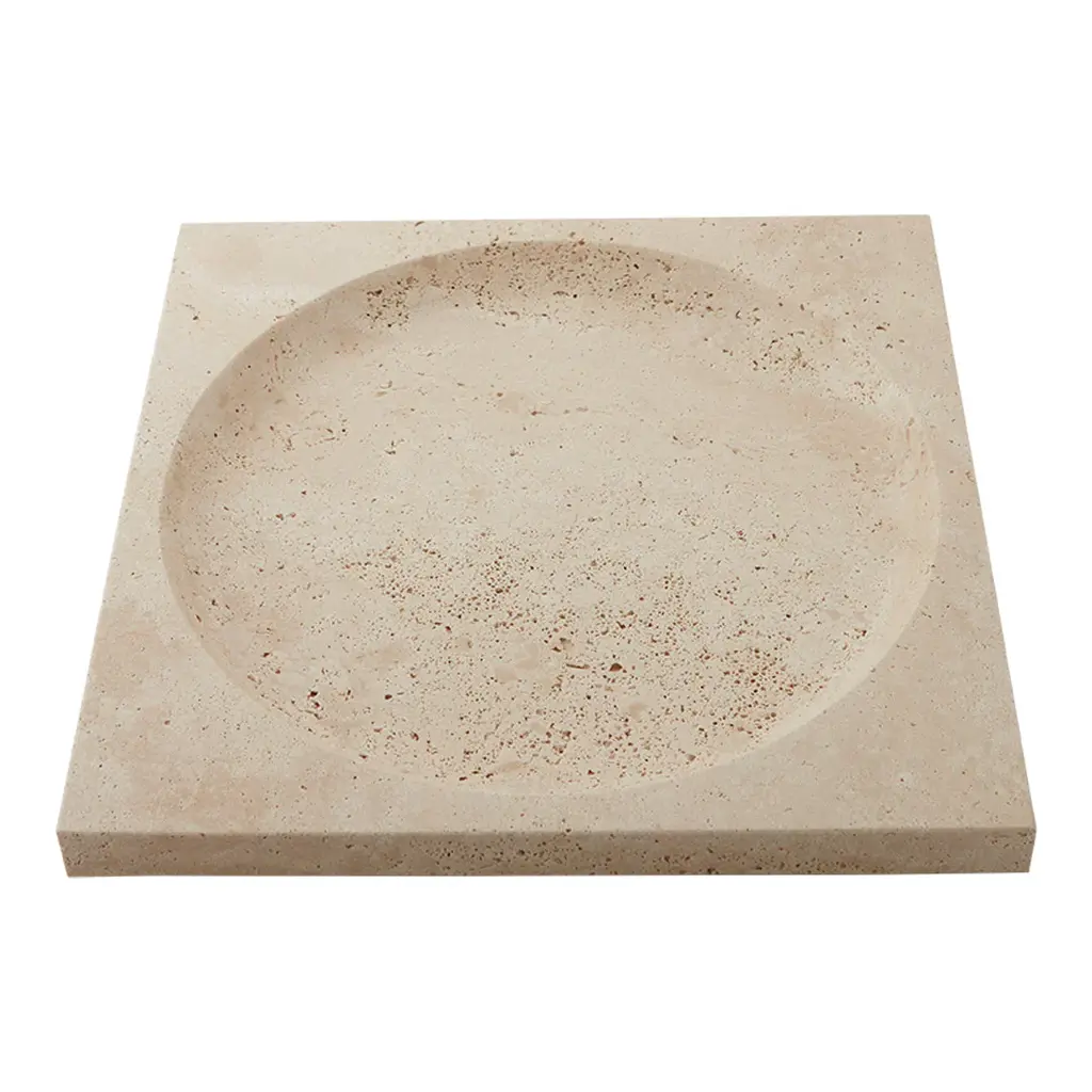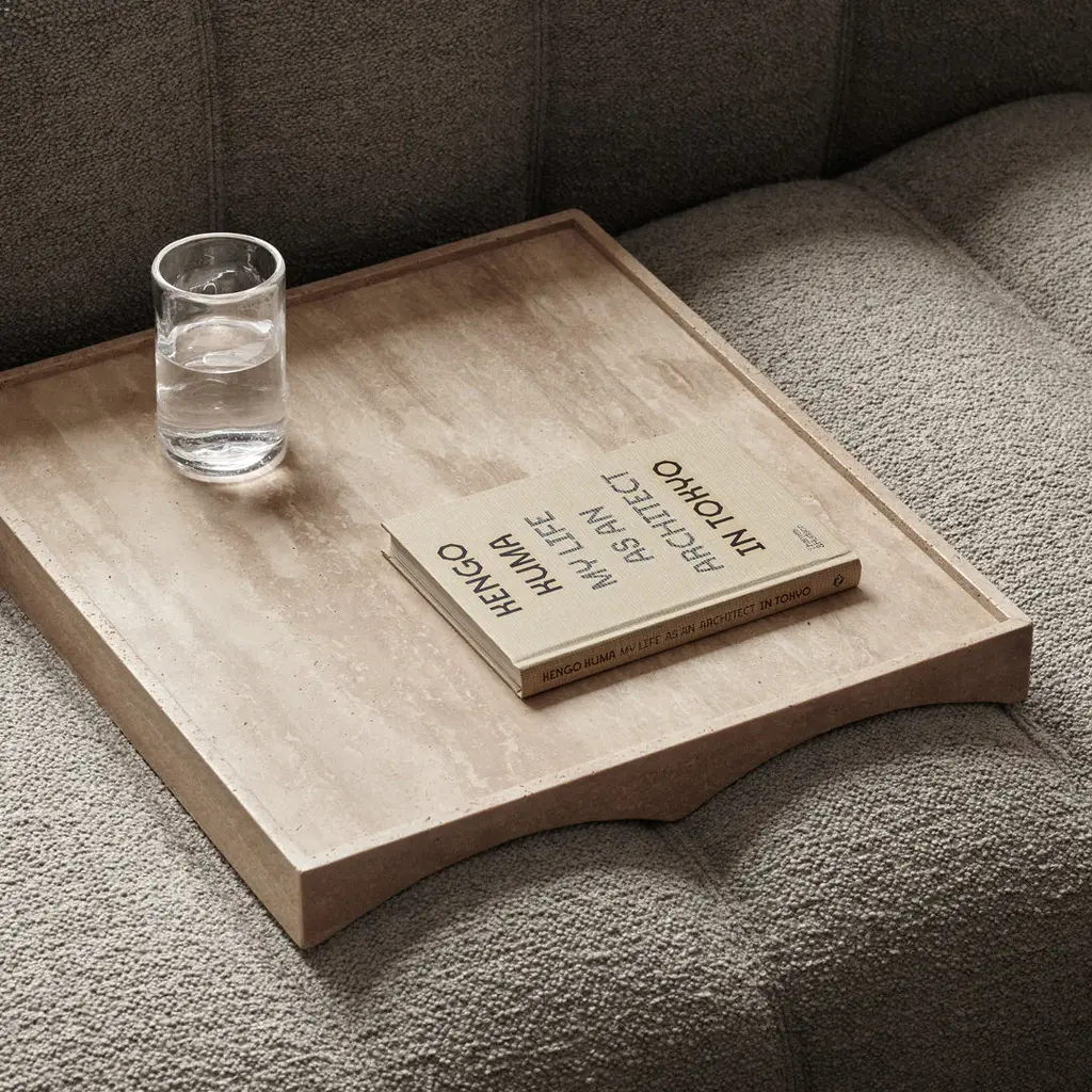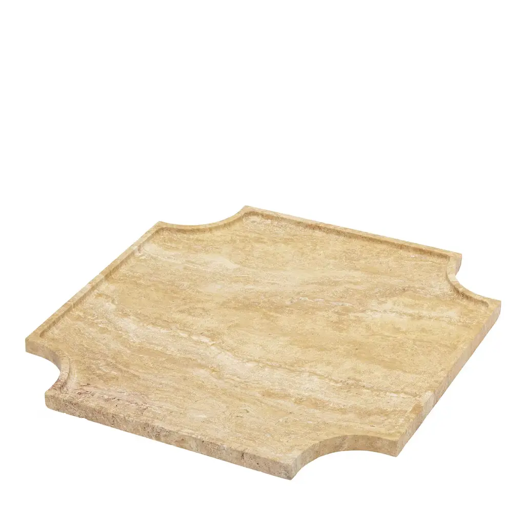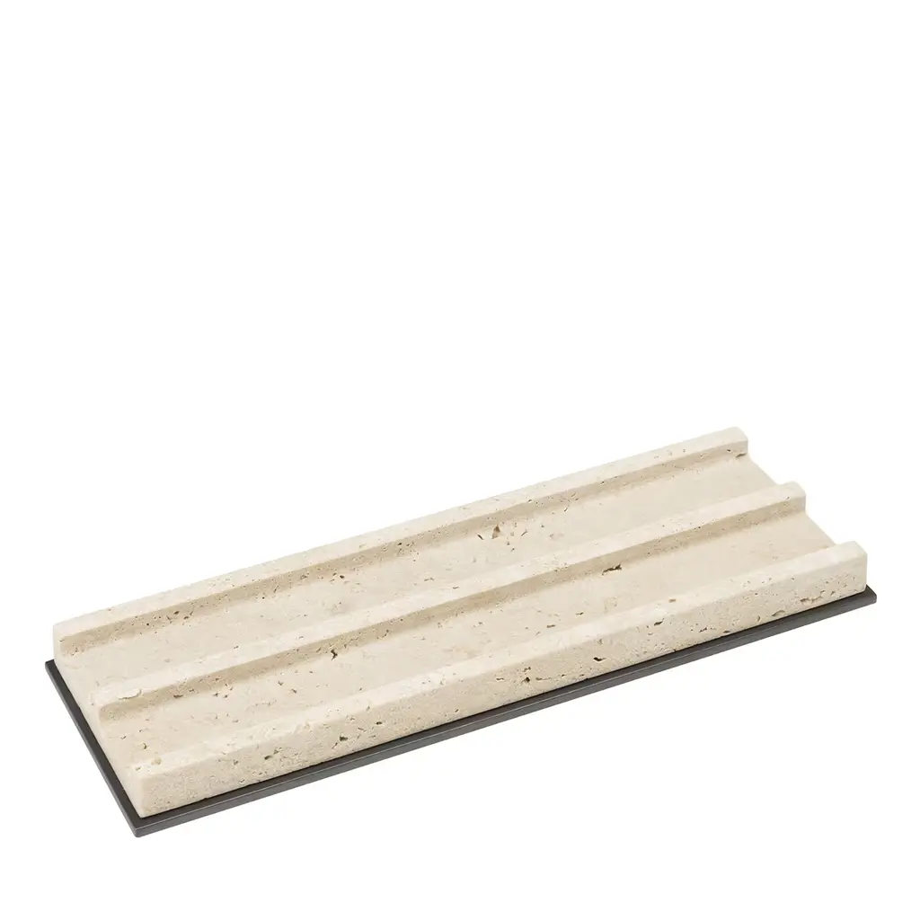 Studio Tray is a functional and refined tray, designed to perfectly complement the Studio sofa. The tray comes in two different sizes and is made of travertine, offering a beautiful contrast to the Studio's soft shapes and fluted upholstery. A raised edge along the perimeter of the tray enhances both its design finesse and practical purpose. This edge securely holds glasses or cups in place and prevents spills from reaching the sofa, making the tray a functional and aesthetic accessory for relaxing moments on the sofa.