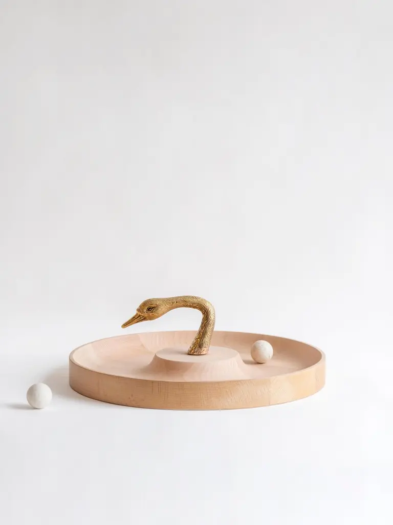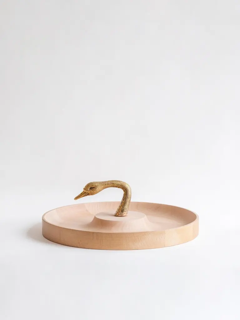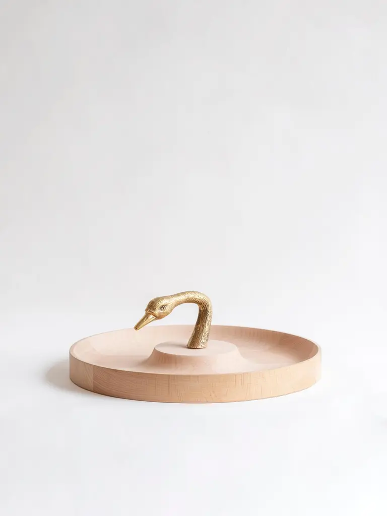 Swan T-Trays by ZPS StudioDimensions: D 3.4 x H 1.6 cmMaterials: Wood, brass.Hand lathe turned centerpieces in beech wood, with an elegant natural finish that contrasts beautifully with the central cast bronze handle, skillfully crafted by a Florentine artisan. Their versatility allows them to serve as refined trays or elegant fruit bowls, adding a touch of class and functionality to any setting.ABOUTZPSTUDIO is an architecture and design firm that emphasizes multidisciplinarity and innovation in every project. Established in Florence in 2003 by Eva Parigi and Matteo Zetti, the practice is focused on pursuing the perfect balance between tradition and avant-garde. Taking advantage of a year-lasting experience, spanning between different areas (retail, interior and product design) the work of ZPSTUDIO has earned its reputation by delivering the most accurate consultancy to its customers, providing them with an extensive and integrated vision of their needs. Attention to detail in every project is paramount to the company’s success in a broad range of works. The company’s services include interior design, architecture, product design, custom furniture and lighting, project development. Over time ZPSTUDIO works have been awarded in international design competitions, and they are being featured in leading specialized press.