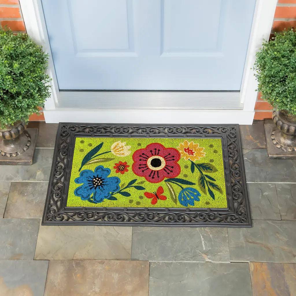 This Mat Tray features a border that creates a subtle flourishing pattern along the edges of this insert tray. This seasonal, switchable mat features a 16 x 28 inch space for Evergreen's coir doormats. This mat frame is made of recycled rubber and is mildew resistant, featuring a skid-resistant backing to help keep the mat in place. This mat is safe for indoor or outdoor use. For stains, simply spot clean with soap and warm water.