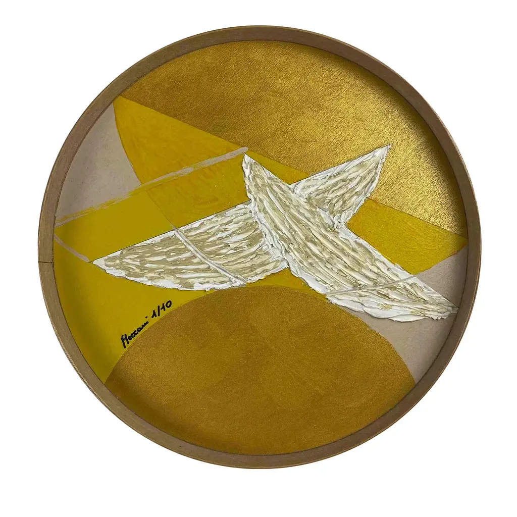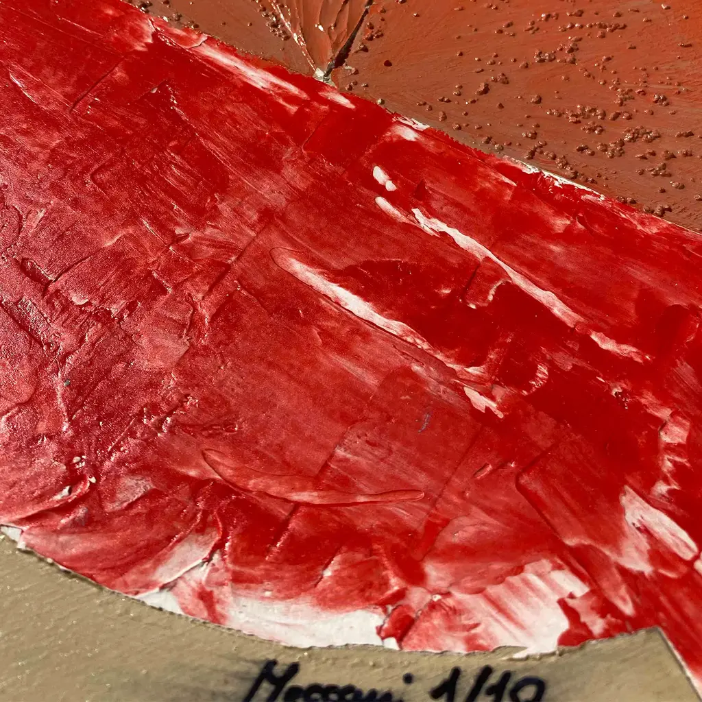 A unique objet d'art in the shape of a wooden tray, this design by Meccani Studio was deftly handcrafted by mixing different techniques and materials such as plaster and sand. The daring use of color, from the contrast between rust and beige to the dynamic red brushstrokes on plaster, contributes to its inebriating artistic allure. Part of a limited edition of only ten numbered pieces.
