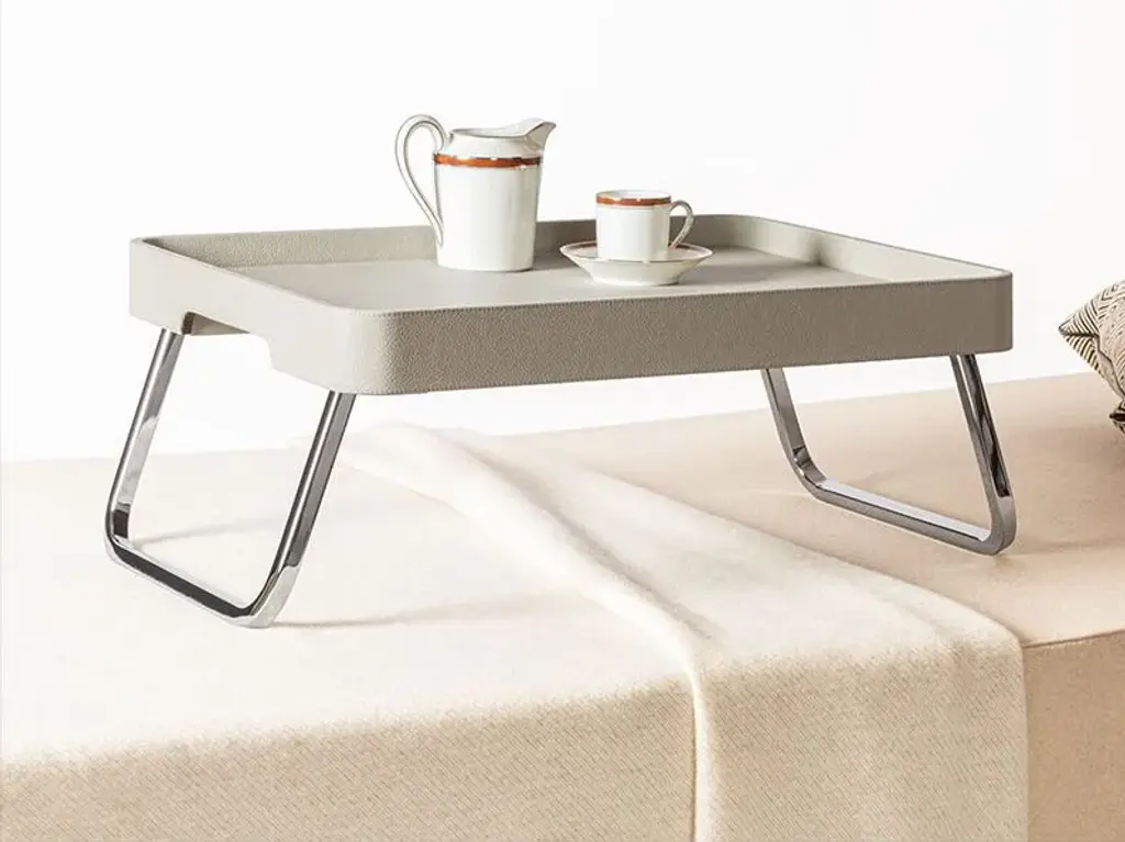 Having breakfast in bed is a true little luxury, and even more so when it's served on this tray. The bed tray designed by Giobagnara for Poltrona Frau is made of steel with a rectangular top, fully covered in Pelle Frau® leather and available in various colors. The raised edge along the entire perimeter stops objects from slipping. Two recesses on the short sides make it easy to grab and carry the tray.The Tableware Collection, created in cobranding with Giobagnara, is a family of coordinated dining table accessories, designed to add a sophisticated and precious touch to even the simplest dinner party. The collection offers a wide range of elegant and practical elements to enrich the social gathering, all upholstered in Pelle Frau® leather and meticulously handcrafted down to the finest of details. The Tableware Collection accessories evoke a warm and inviting atmosphere and a spirit of hospitality, reflecting thoughtfulness and consideration for others, enhancing the pleasure of every dining experience.