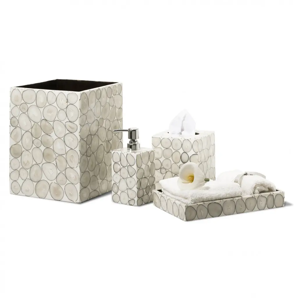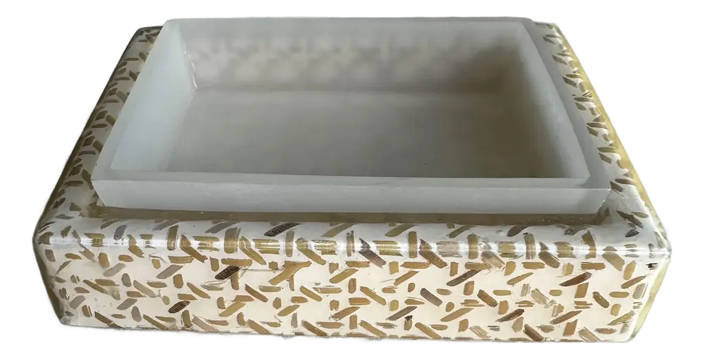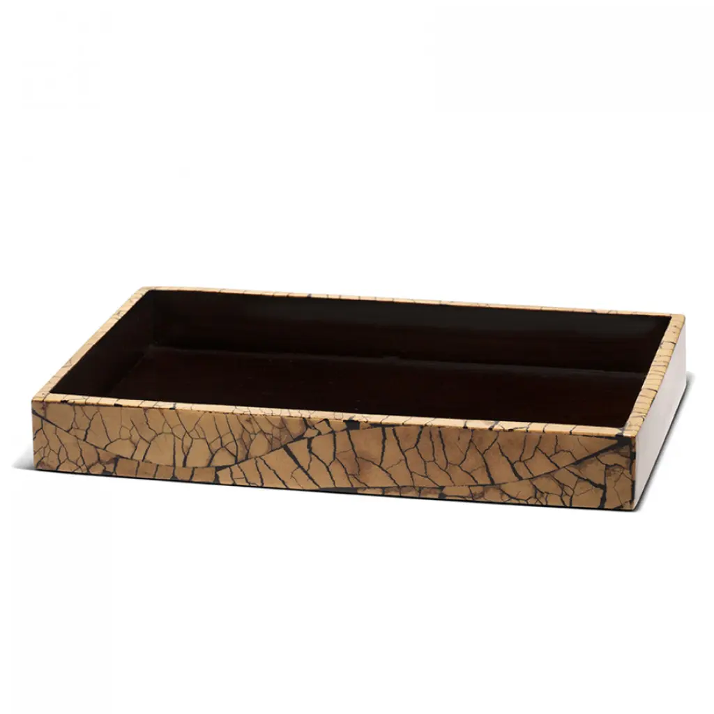 - Handcrafted vanity tray made of wood and Tagua from Colombia. - A seed from a South American palm tree, tagua is dried, sliced, and inlaid resulting in a unique and organic look.