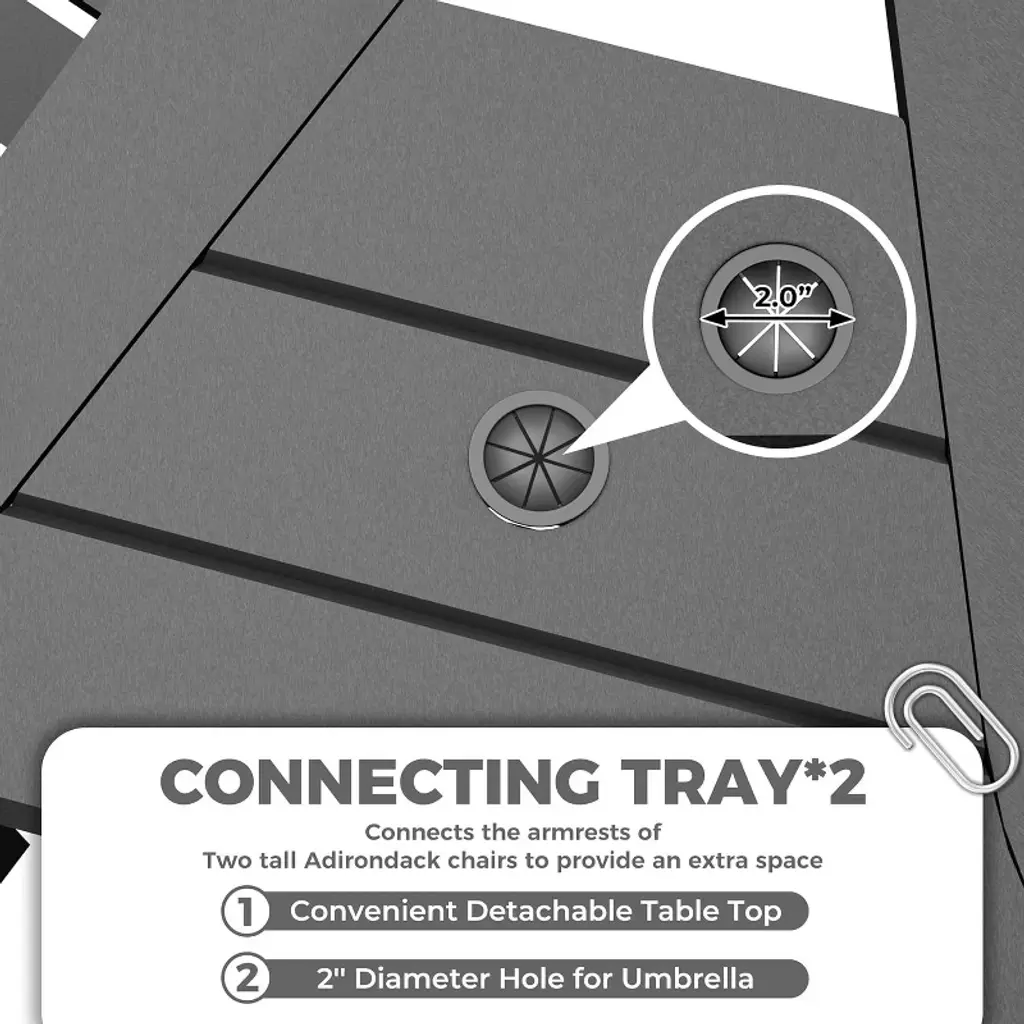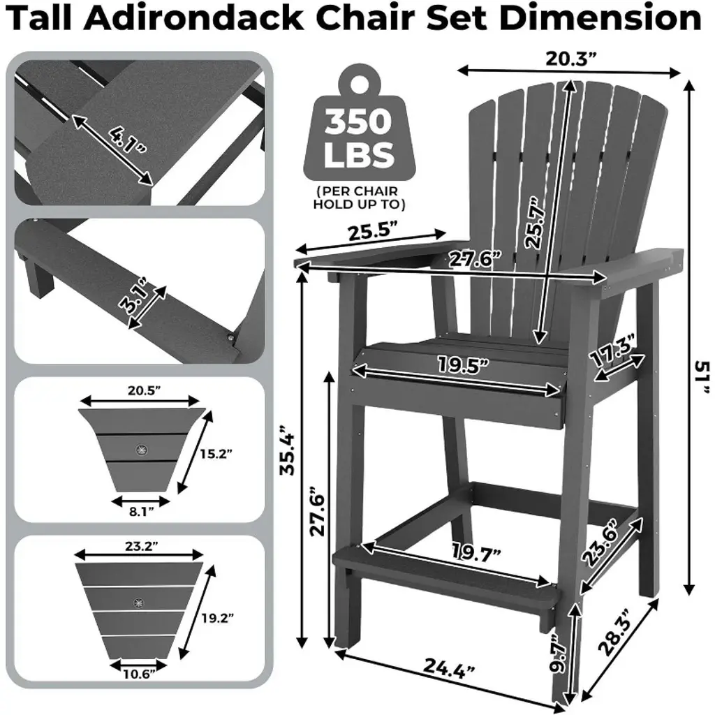 Description:Upgrade your outdoor living space with this premium Tall Adirondack Chairs Set of 2, expertly designed to combine style, comfort, and durability. Whether placed on your deck, balcony, or patio, these high bar-height Adirondack chairs deliver an exceptional lounging experience with ergonomic contours, spacious seating, and convenient double removable trays. Crafted from weather-resistant, recyclable HDPE, they withstand the elements while requiring minimal maintenance, making them perfect for year-round outdoor use. Enjoy easy assembly, sturdy support for up to 350 lbs per chair, and added features like double connecting tray and umbrella holes for shade, transforming any outdoor area into a cozy and stylish retreat.