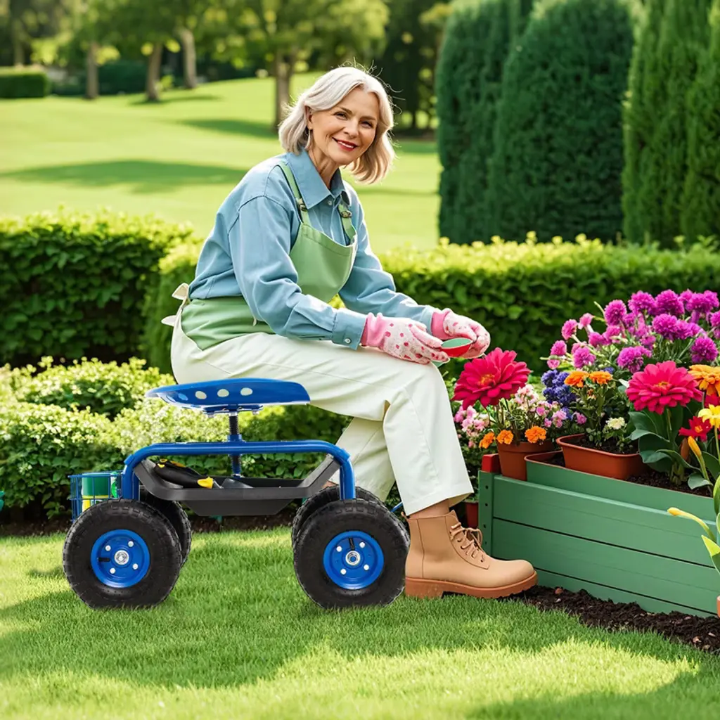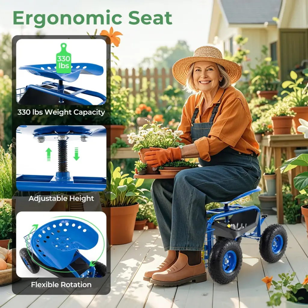 Discover the ultimate solution to your gardening needs with the rolling garden cart. The ergonomically designed seat adjusts in height and rotates smoothly, allowing you to tend to your garden in comfort. Besides, the spray-painted metal frame is robust and wear-resistant, making it a reliable choice for long time use. What’s more, the gardening cart is designed with a tray and a basket for various tools. The smooth rubber wheels glides effortlessly across various terrains, while the integrated steering handle provides unmatched maneuverability. Make gardening more enjoyable and productive with the wagon scooter that’s built to handle your needs. Features10" rubber wheels for smooth transport on different terrainsErgonomic & adjustable seat for comfort during extended useRotating design suits your tasks and movementsSpray-painted metal frame is sturdy and withstands outdoor conditionsUnder-seat tray and rear metal basket for convenient storageSpecifications: Color: Green/Red/Blue Material: Metal Overall Sizes: 33" x 18" x 18"-21.5"/84 x 45.5 x 45.5-54 cm (L x W x H) Weight Capacity: 330 lbs/150 kg Net Weight: 29 lbs/13 kg Package includes: 1 x Garden Cart 1 x User’s Manual