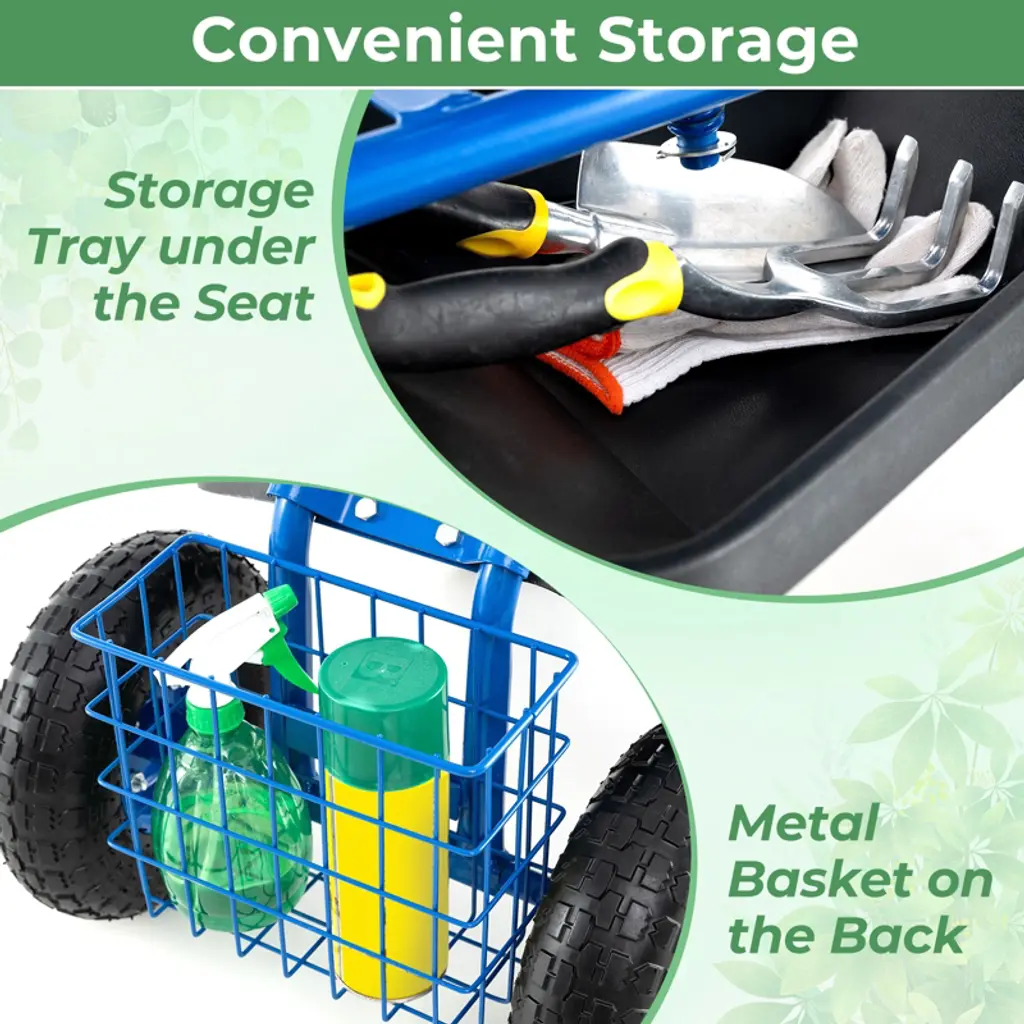 Tangkula Rolling Garden Cart Wagon Scooter W/ 360° Swivel Seat & Storage Tray & Basket Blue