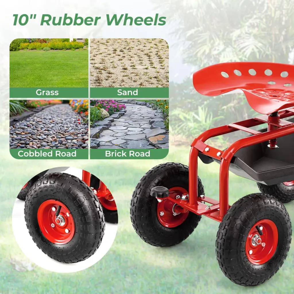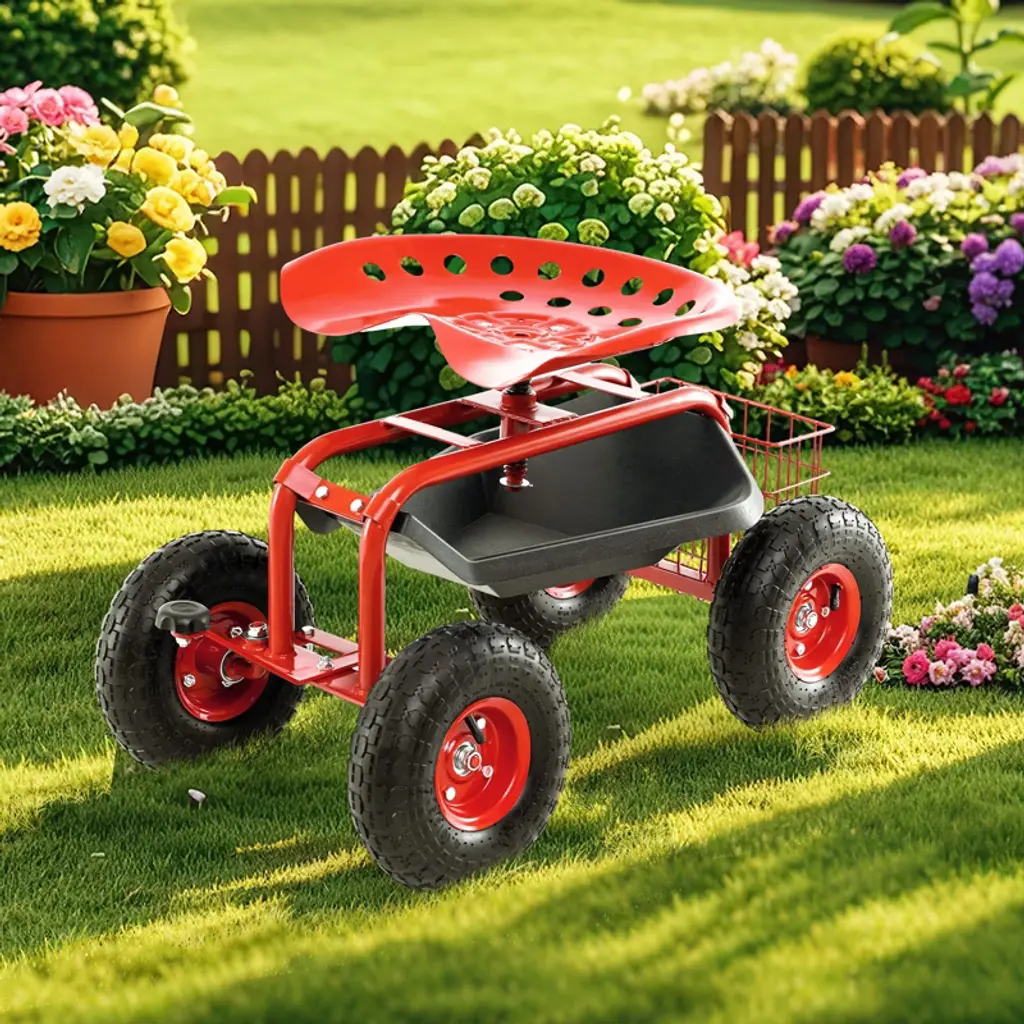 Discover the ultimate solution to your gardening needs with the rolling garden cart. The ergonomically designed seat adjusts in height and rotates smoothly, allowing you to tend to your garden in comfort. Besides, the spray-painted metal frame is robust and wear-resistant, making it a reliable choice for long time use. What’s more, the gardening cart is designed with a tray and a basket for various tools. The smooth rubber wheels glides effortlessly across various terrains, while the integrated steering handle provides unmatched maneuverability. Make gardening more enjoyable and productive with the wagon scooter that’s built to handle your needs. Features10" rubber wheels for smooth transport on different terrainsErgonomic & adjustable seat for comfort during extended useRotating design suits your tasks and movementsSpray-painted metal frame is sturdy and withstands outdoor conditionsUnder-seat tray and rear metal basket for convenient storageSpecifications: Color: Green/Red/Blue Material: Metal Overall Sizes: 33" x 18" x 18"-21.5"/84 x 45.5 x 45.5-54 cm (L x W x H) Weight Capacity: 330 lbs/150 kg Net Weight: 29 lbs/13 kg Package includes: 1 x Garden Cart 1 x User’s Manual