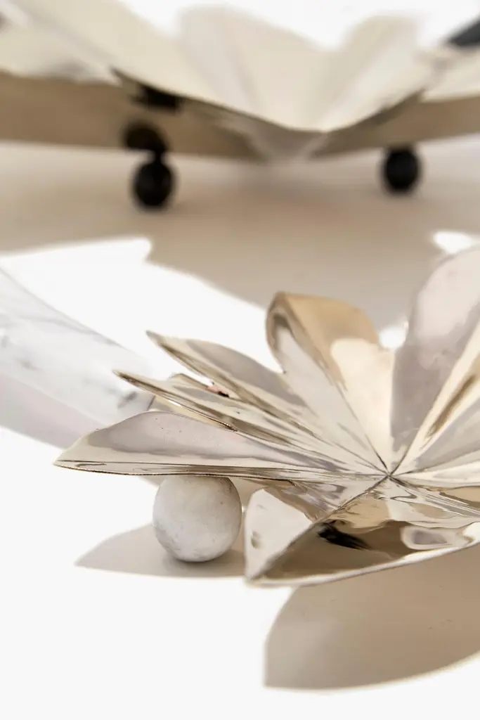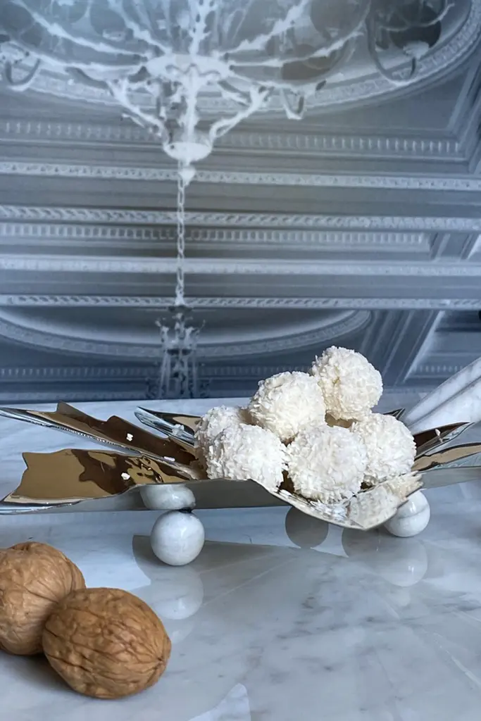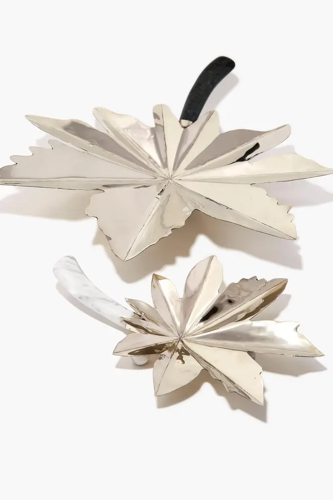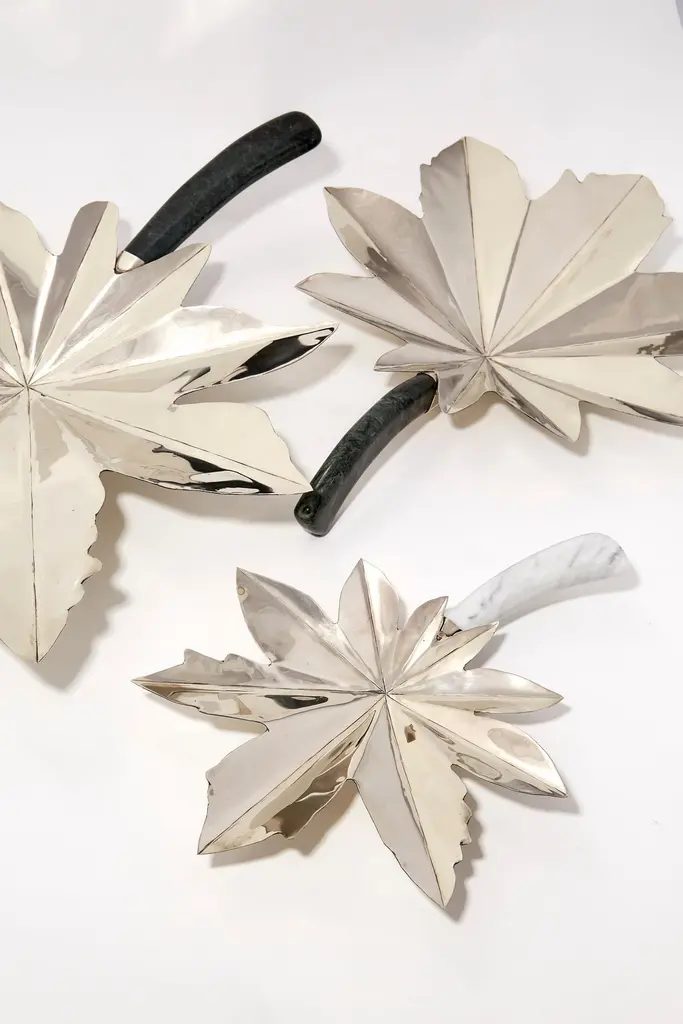 Like the Tatarian maple tree leaves, the irregular toothed edges made in alpaca with a marble or goat horn engraved handle are the basis of the tray design of this family, which emphasizes an original and unique finish.Our pieces are made by hand. One of a kind.Natural onyx may vary in color.