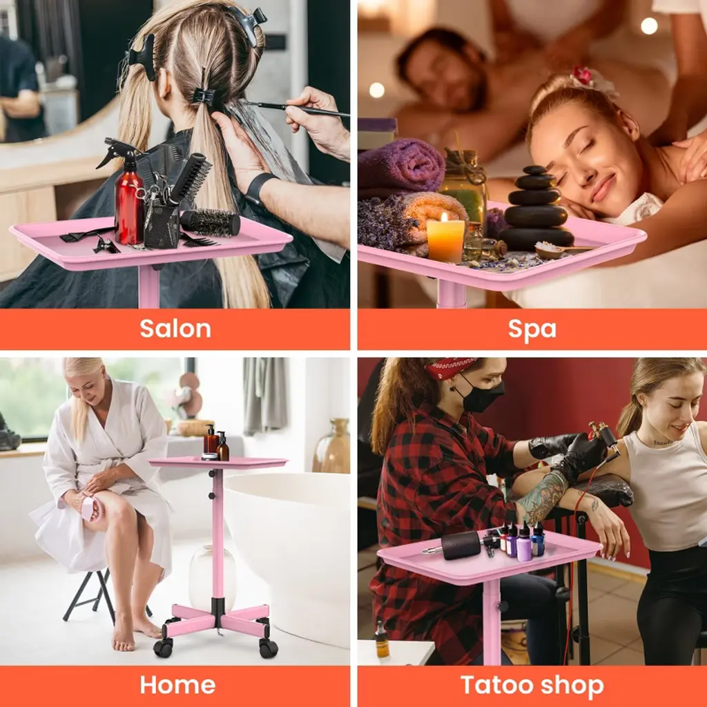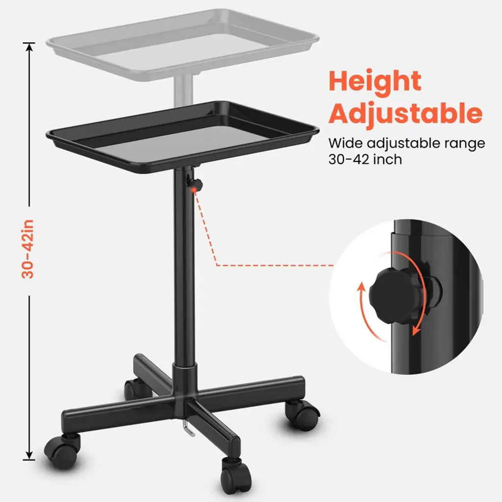 With its fashionable design and mix of premium materials, this utility salon tray cart adds a touch of sophistication and modern style to your salon workshop. Its tray frame is crafted from aluminum, and it comes in your choice of gold/pink finish with a sheen. Adjustable height from 30" to 42" which provides a customizable and comfortable working experience for you. This tray cart perfectly matches a salon, dentist, esthetician, tattoo studio, etc. It stands out while blending in seamlessly with your stylish studio décor.