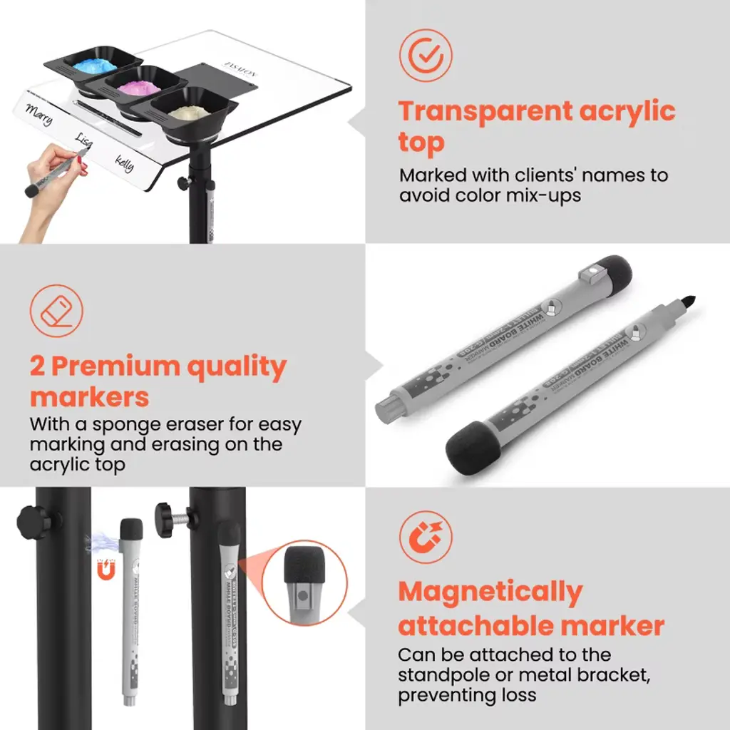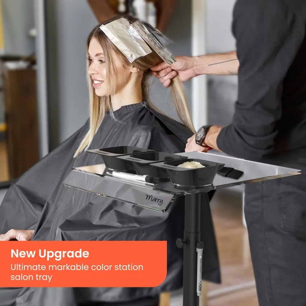 Upgraded modern writable salon tray is an excellent tool for stylists who handle multiple clients. The tray, made of transparent, markable acrylic, allows you to write down each client's details directly on its surface. This feature significantly reduces the likelihood of confusing colors or forgetting key information. Equipped with two magnetic pens, you can easily note the client's name, time, and chosen dye color. Metal poles with magnetic attraction, keeps your tools from getting lost. Embellis your salon studio with both decorative and practicality!