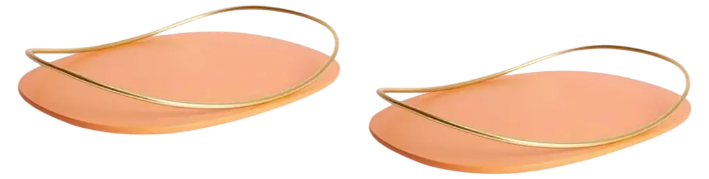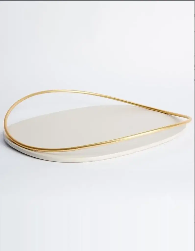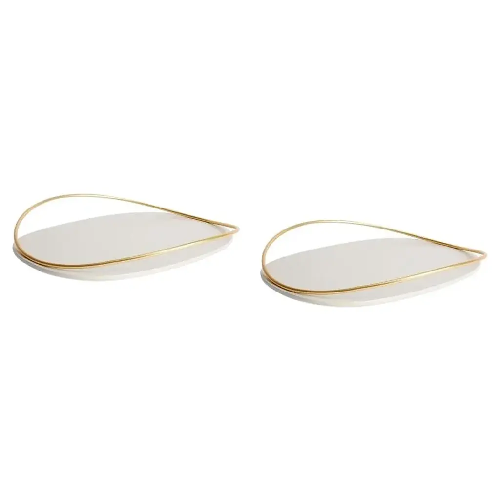 Pair of taupe touché d trays by mason editions dimensions: 36 × 48 × 6.4 cm materials: iron and mdf colors: taupe, cotto, burgundy, sage green, petrol green a light metal rod that rests on the surface and then lifts up, almost touching the surface with a quick tap, a movement that defines the handles of touché trays. The organic shape of the oval base communicates with the thin tubular, giving the impression of a perpetual undulatory motion, which seems to vanish when the trays are looked at from above. This oval tray with a round handle won’t go unnoticed in the eyes of your party and dinner guests. The round mdf base is available in several colors, with a slim handle in galvanized 24k gold. A sleek design that adds a touch of luxury to your dining experience.