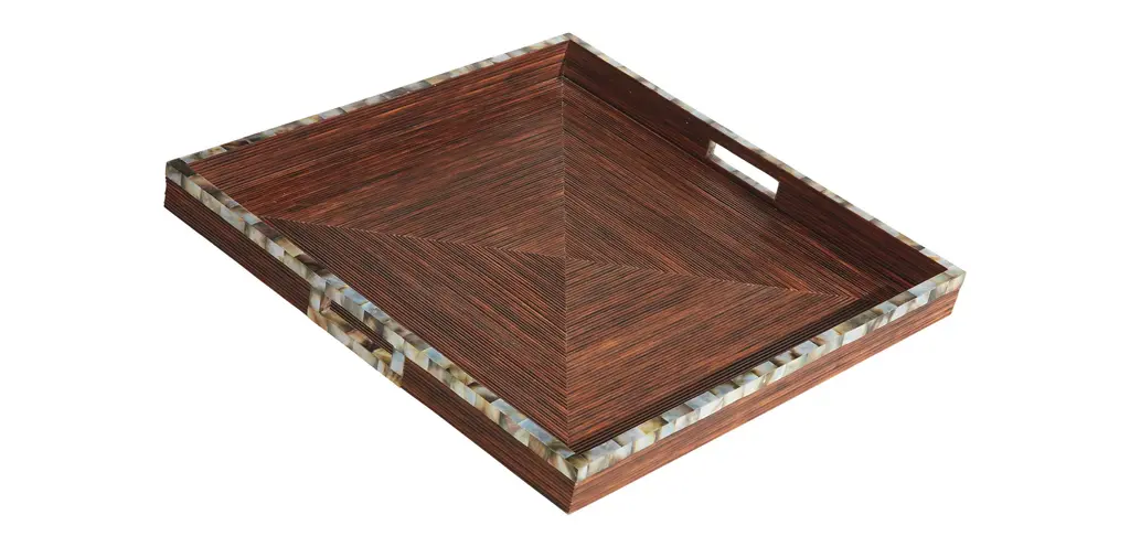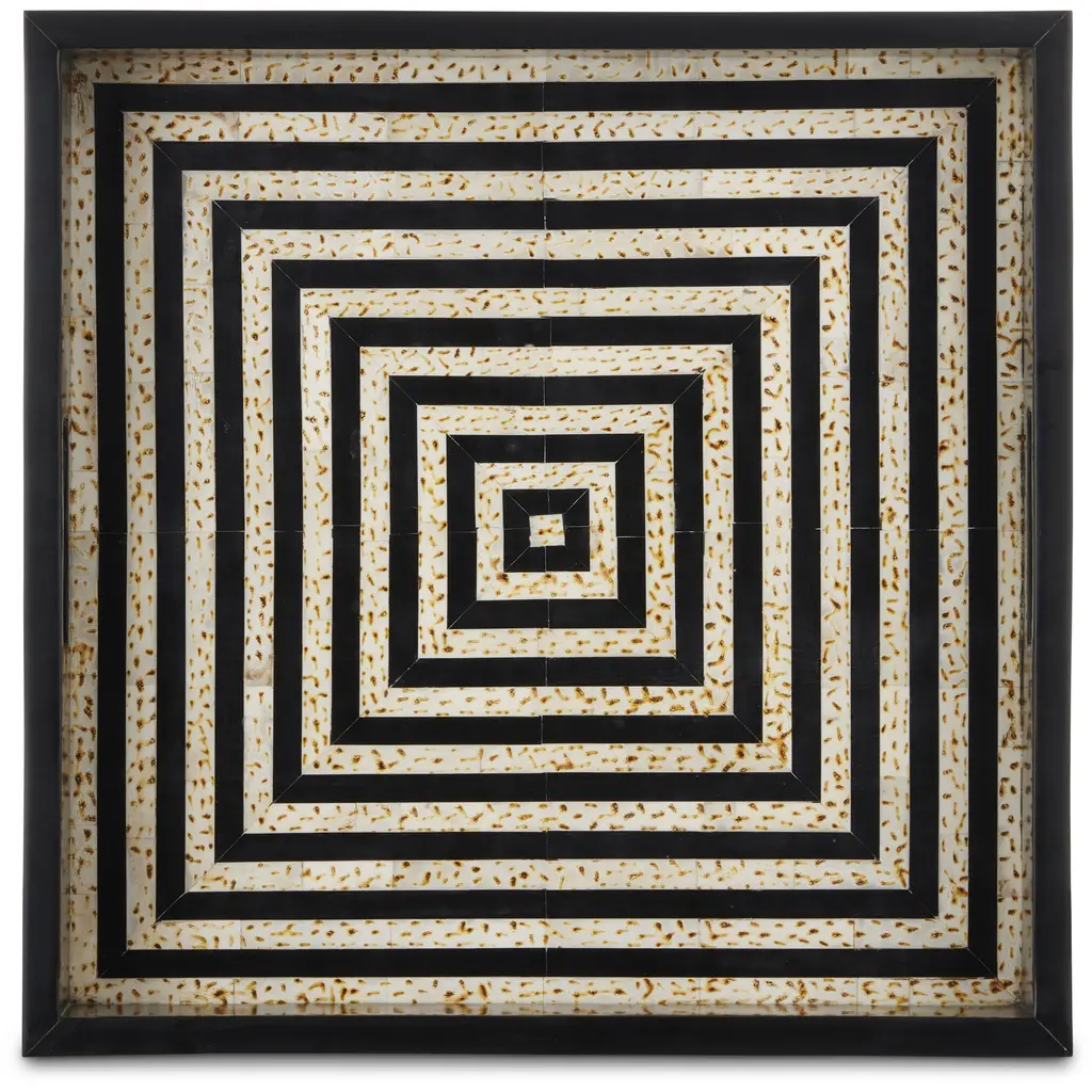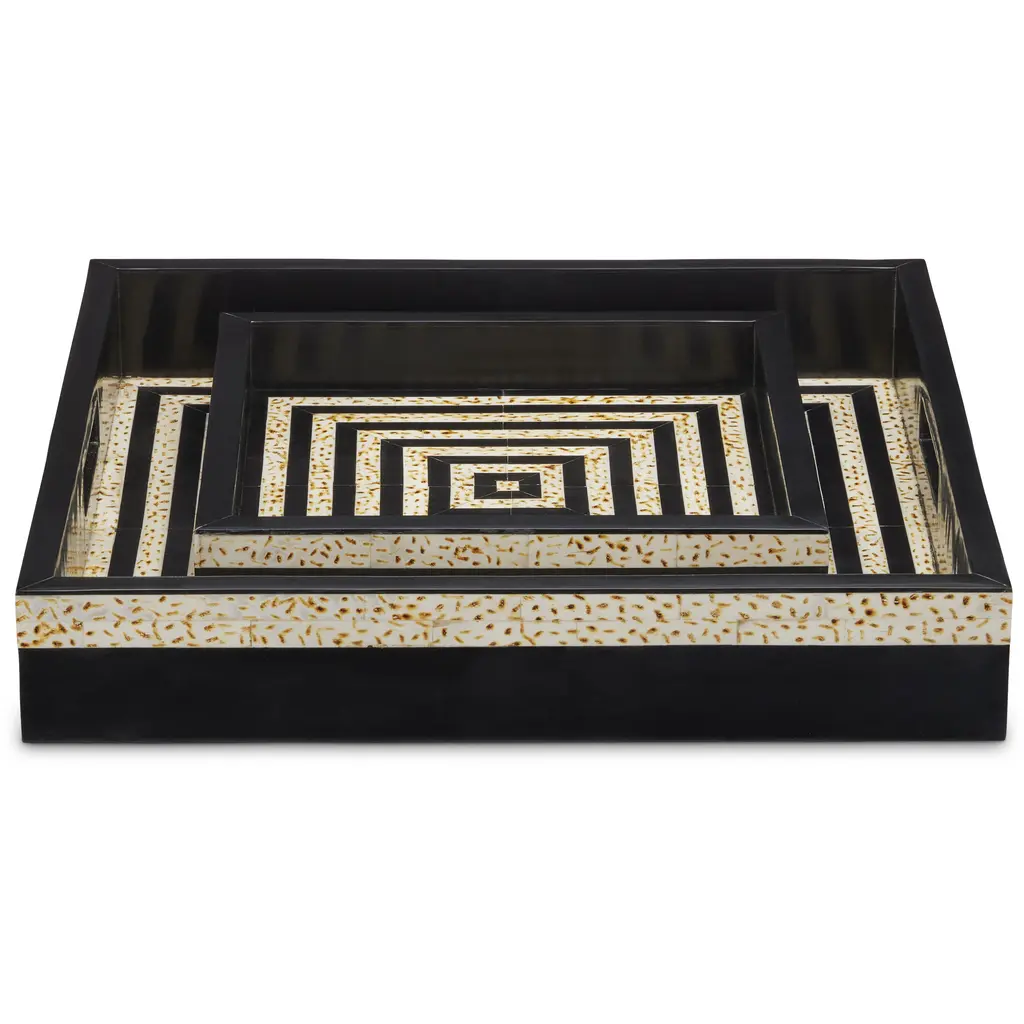The Taurus Tray Set has a number of artisanal aspects to its design and construction. The handmade ivory and black decorative trays have square mitered profiles—the small one sans handles and the large one with openings to grasp. Once the bone and composite materials have been fitted together in tidy lines, texture is achieved on the surfaces when artisans mark the white speckled bone with a brazing tool. This level of specificity and the fact that the trays are composed like intricate puzzles make these special accent pieces designed by Aimee Kurzner.