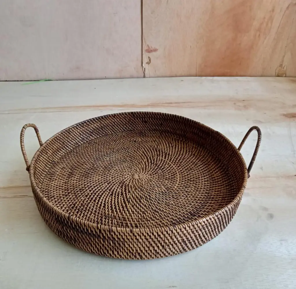 Hand woven tea stain rattan round tray with handles. Each slightly unique in natural material differences and handmade qualities and each sold individually.