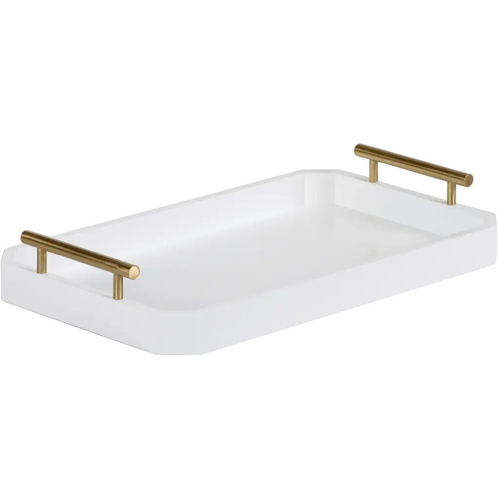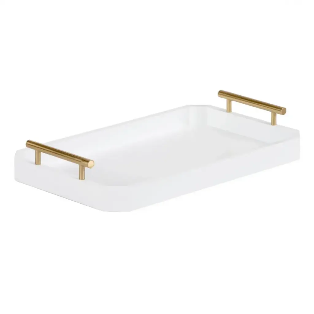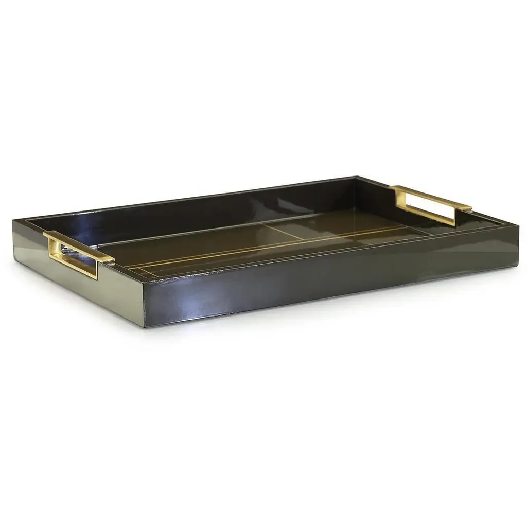 The Tenebra Tray is a sleek, contemporary accent piece with an elegant black color elevated through gold detailing. This stylish tray features rectangular handles in a Brushed Brass finish, completing the look.