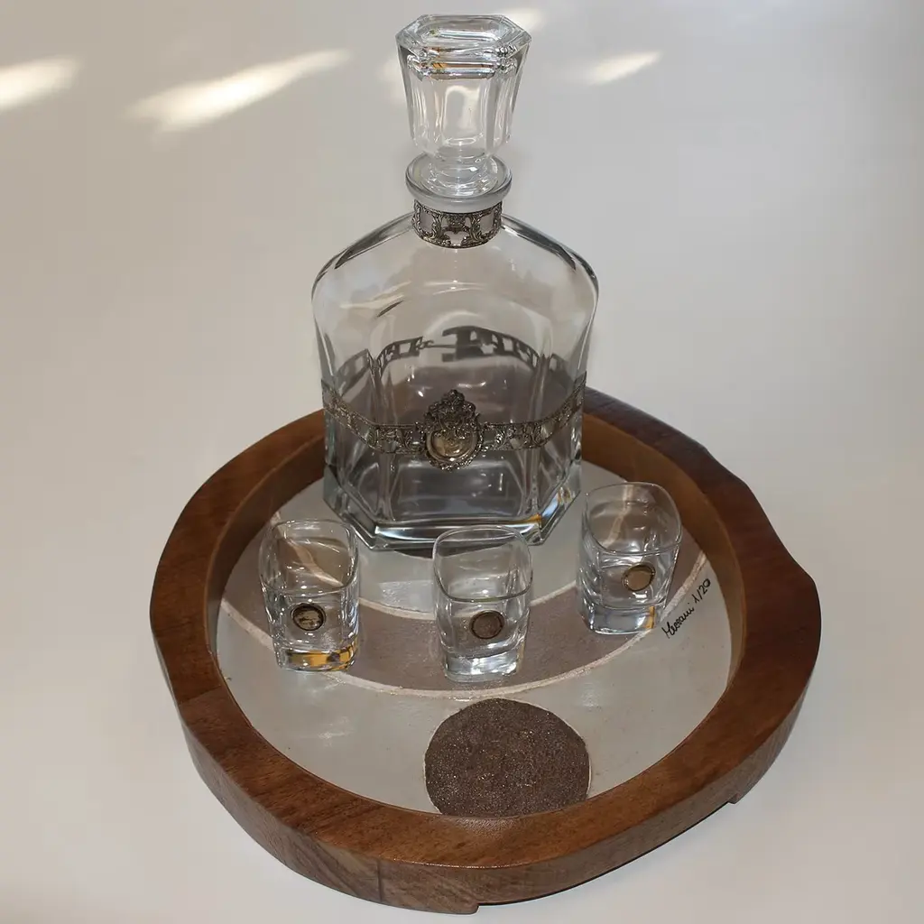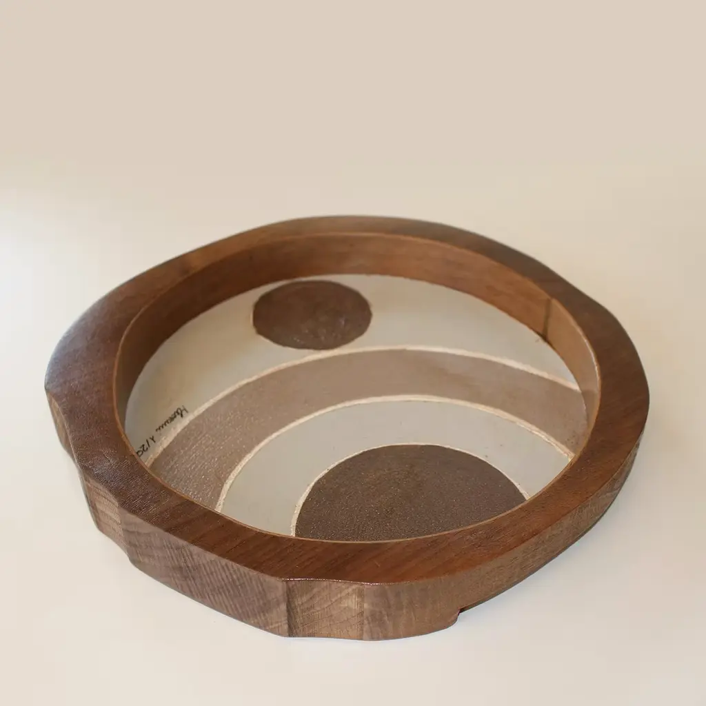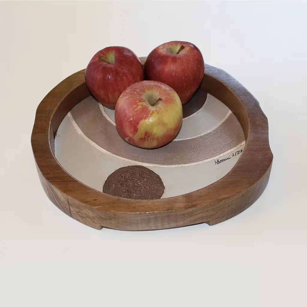 Decorative and functional, this tray is part of a 2017 limited editions of 20 pieces inspired by nature. Carved out of a walnut wood slice of trunk, with a naturally irregular round shape, the bottom has an exquisite geometric decoration realized by hand in the tomes of sand, beige and maroon. The fine craftsmanship of this tray highlights the inherent qualities of a warm wood and gives this versatile piece a unique quality.