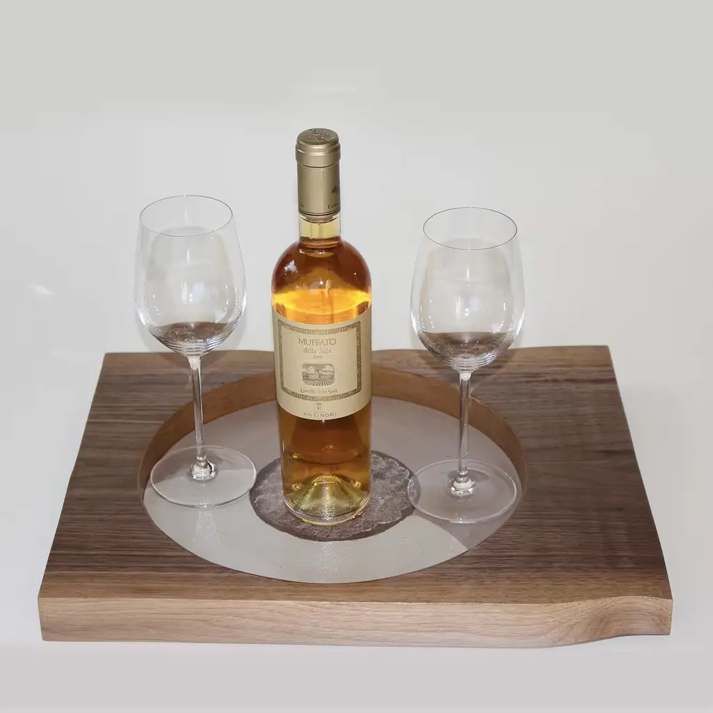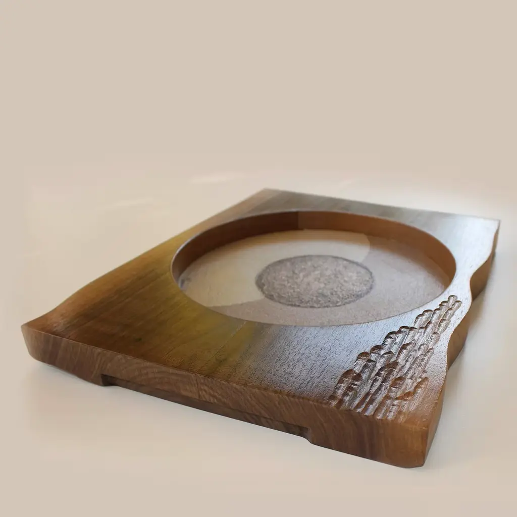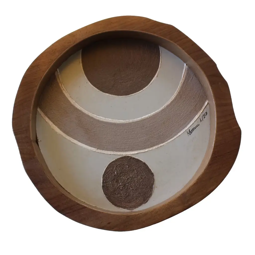 Part of an exclusive collection of only 20 pieces, this wooden tray was handcrafted of walnut and entirely decorated by hand. Its rectangular silhouette is adorned at the center with a deep round inlay with a central accent in it. The piece is protected with a non-toxic, water-based varnish that makes it scratch-resistant and shockproof. A stunning object of functional decor, this tray can be used or displayed in many different occasions, alone or combined with the others by the same designer.