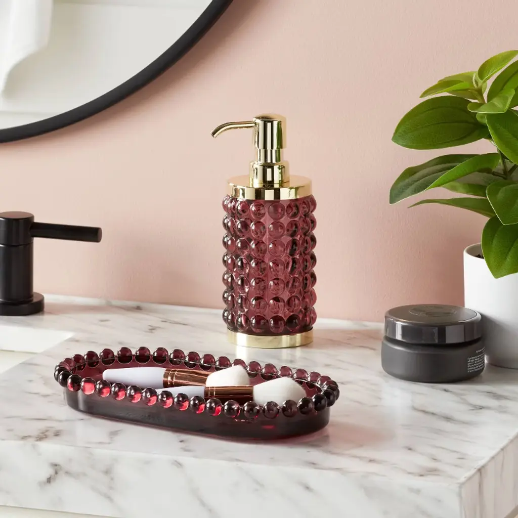 Enhance the aesthetics and functionality of your bathroom or dresser with this Textured Glass Tray from Threshold™. Made of glass, this oblong tray features a beaded design over the rim that elevates the visual appearance of your bath. Designed in a mulberry hue, this glass tray is ideal for keeping makeup brushes, skin creams, lip balms, and other essentials. Threshold™: Looks like home, feels like you.